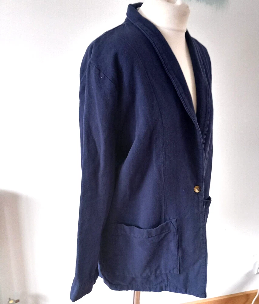 Gently used condition with no faults found. Boxy chore jacket. 100% cotton. Measures 23" pit to pit so meant to be oversized, 21" across waist area approx, length nape to hem 30". Made in USA.