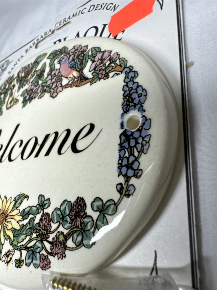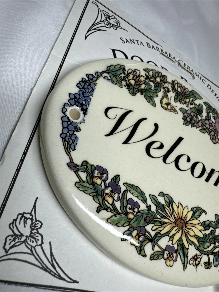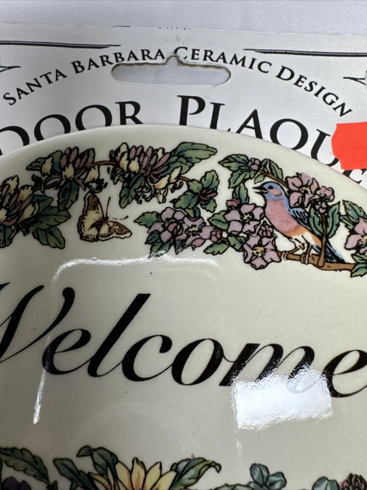 Welcome Door Plaque Santa Barbara Ceramic Design White butterflies and birds, 5” Oval Please see all photos cardboard backing does have some damage and markings plaque is intact.