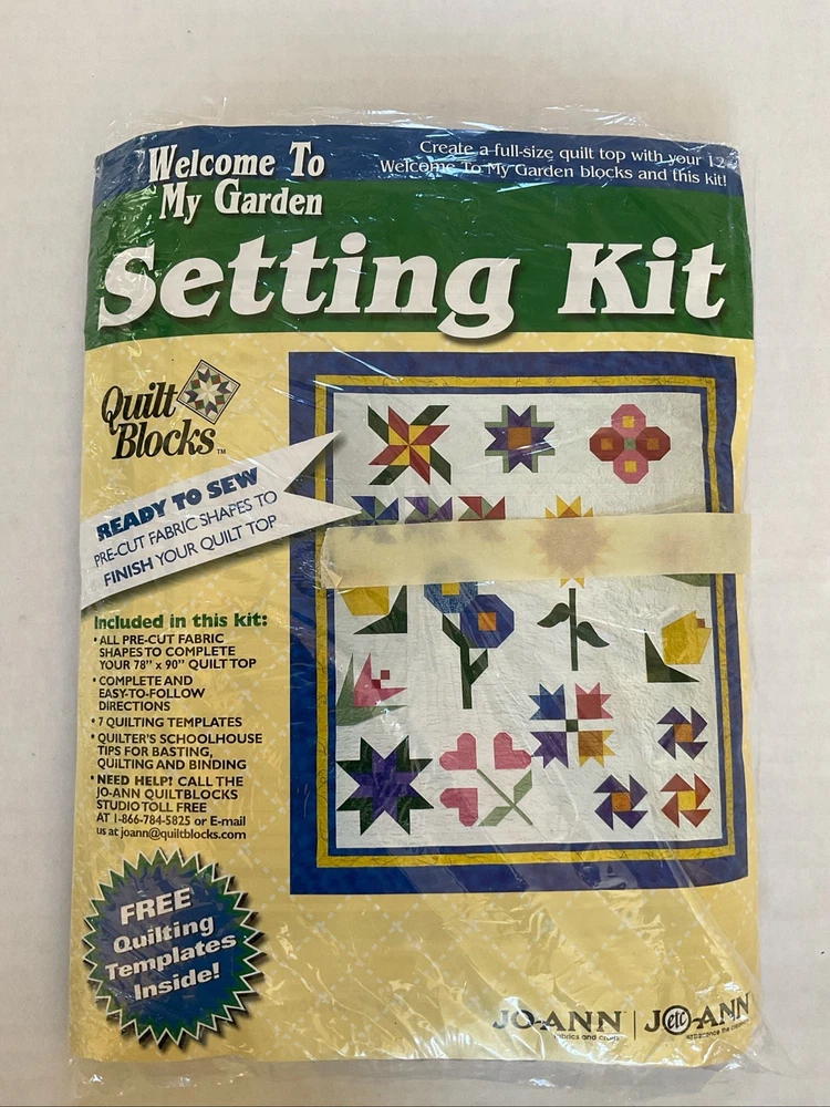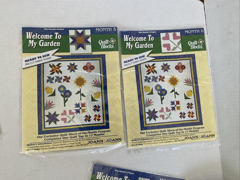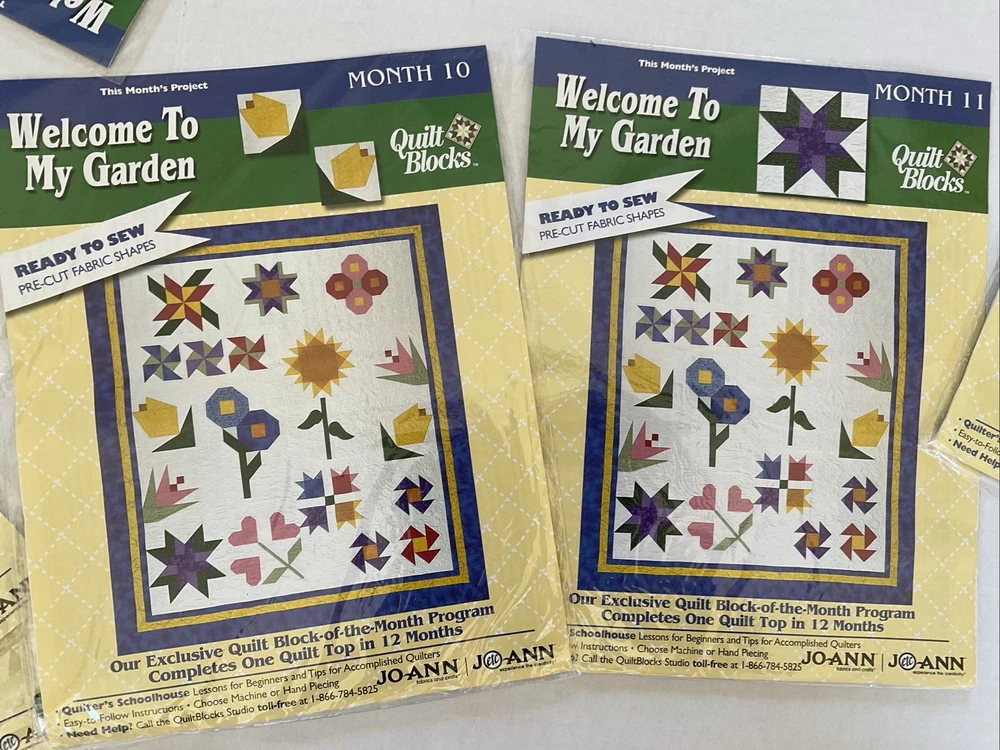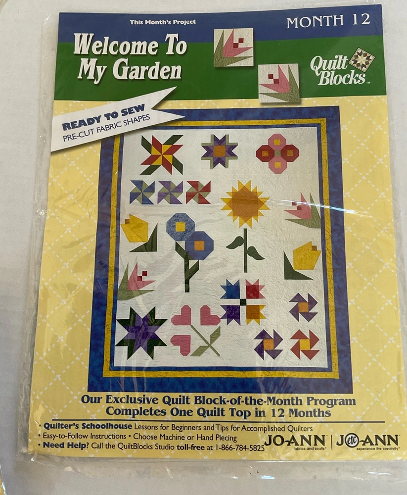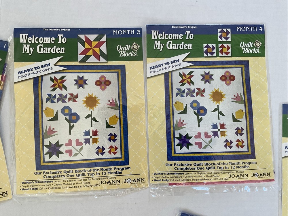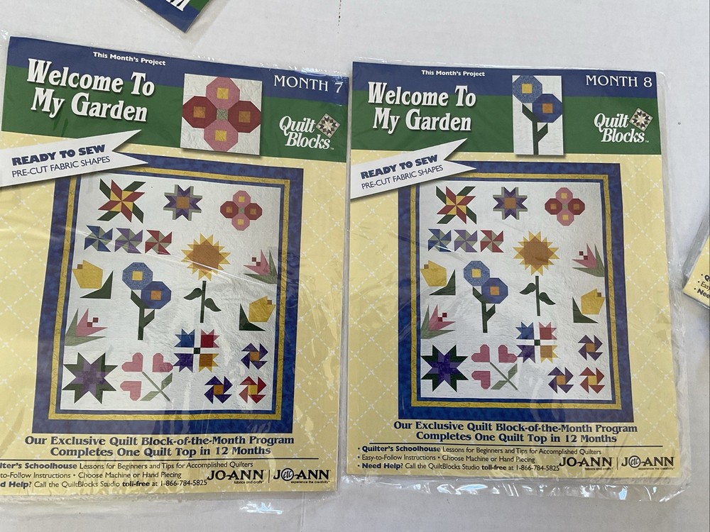 Welcome To My Garden JoAnn Quilt Block of Month 2001. Includes Month 1 which is opened package, months 2-8 (these are sealed) and months 10-12 ( these are also sealed.) There is NO month 9. The lot also contains the setting kit but this package is open. Month 1 & the Setting Kit are both open packages. The other packages are all sealed. The pieces have not been sewn in month 1. The setting kit indicates that it has the fabric to complete the quilt top. This is listed as used due to the 2 open packages.