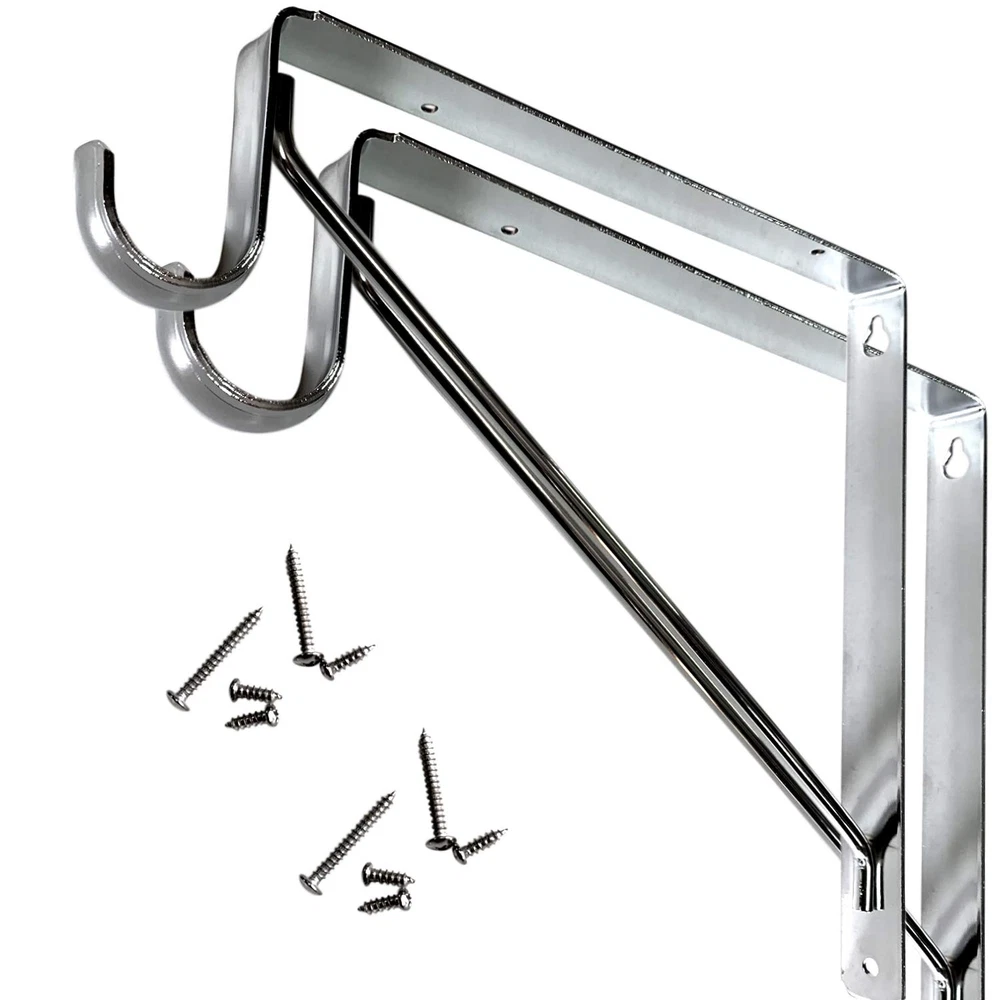 The strongest closet bracket you will ever find... and yet, so easy to install! Real Steel The moment you hold it in your hand, you'll know what we're talking about. The parts of the bracket that lies against the wall and supports the shelf each measure 1" wide and is a robust 1/8" thick. They are connected and strengthened by a diagonal metal rod that's 1/4" diameter that is WELDED in place! Here's another great feature, the steel at the hook is pressed into a strength enhancing profile, that adds a touch of refinement to the bracket at the same time. Nice! EZ Installation The top hole in the bracket is a "keyhole". So just install of the provided screws a bit proud of the sheetrock and hang the bracket in place. Then, lock everything in with a screw at the bottom of the bracket. Add your shelf and attach it from below with 2 screws. We even provide a hole in the back of the hook in case you're using a wood dowel, so you can secure that as well! GREAT FINISH A beautiful polished chrome finiish will surely set your closet apart from all the rest. Even the provided screws are in a matching finish! Here's What You Get heavy duty chrome closet brackets with welded diagonal support Four chrome panhead #10 x 1 5/8" screws for wall attachment. Six chrome #6 x 5/8" panhead screws for shelf and closet pole attachment. SUPER STRONG - All components are of thick metal, with all connections being welded. You really won't find a more robust closet bracket anywhere! SUPERIOR FINISH - Has a very sleek polished chrome finish. Sweet! MATCHING SCREWS - Comes with 2 panhead screws for wall attachment (#10 x 1 5/8"), as well as 3 panhead screws for shelf/wood pole attachment (#6 x 5/8") EZ INSTALLATION - Since the top hole is "keyhole" in nature, just put in the top screw until it's about 1/8" proud of the wall and "hang" the bracket on it. Then lock everything in place with the lower attachment screw! YOU GET - 2 Chrome closet brackets with matching screws