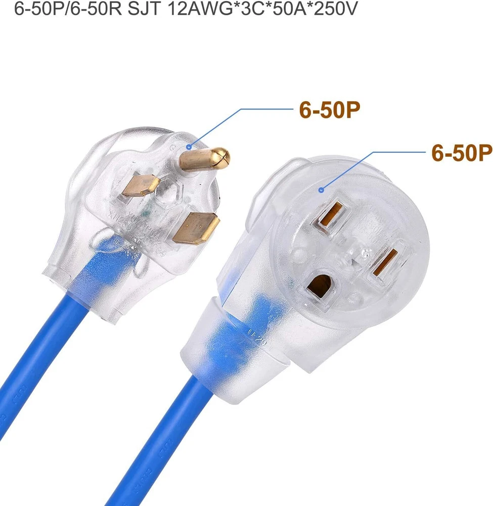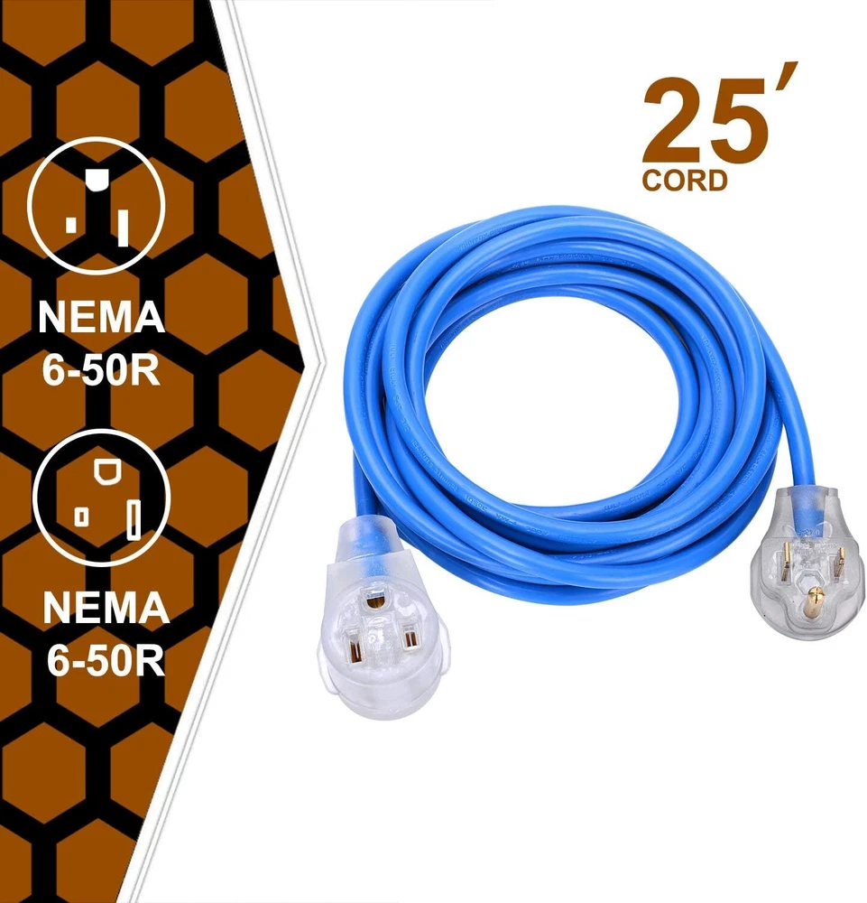 Welder Extension Cord, Heavy Duty 25 Feet 6-50 Nema R Plug Lighted Blue Product Details Color: Blue Brand: S7 Connector Gender: Male-to-Female Voltage: 250 Volts Input Current: 50 Amps Heavy Duty All-copper Wires With 6-50 NEMA Plug And Connector Designed For Use On All Portable Welders Delivers 40 Amps At 250 Volts,With Adjustable Power Cord Organizer Which Is A Carrying Strap. It Can Make The Product Easy To Storage And Carry Lighted Molded 50 Amp Plug And Connector For Added Safety Contractor Grade Stw Jacket Will Easily Hold Up To Industrial Applications 3-Prong Socket With 3-Prong Plug, Right Angle Cord Plug