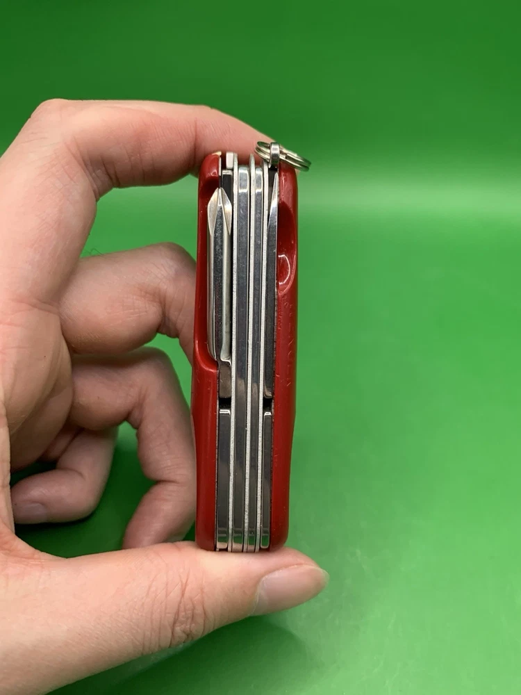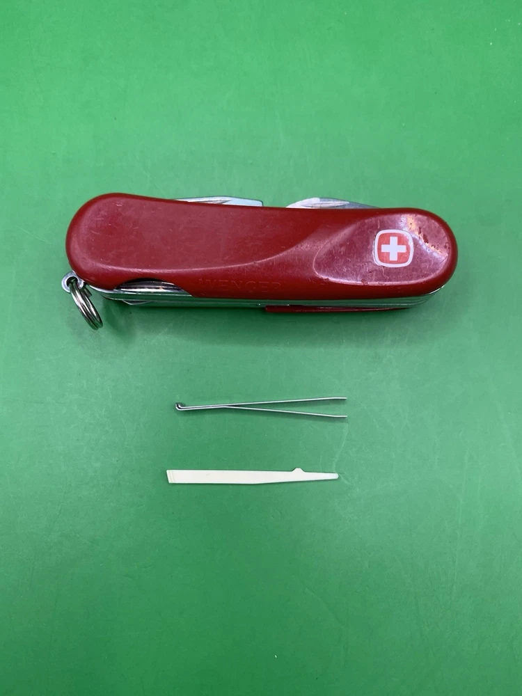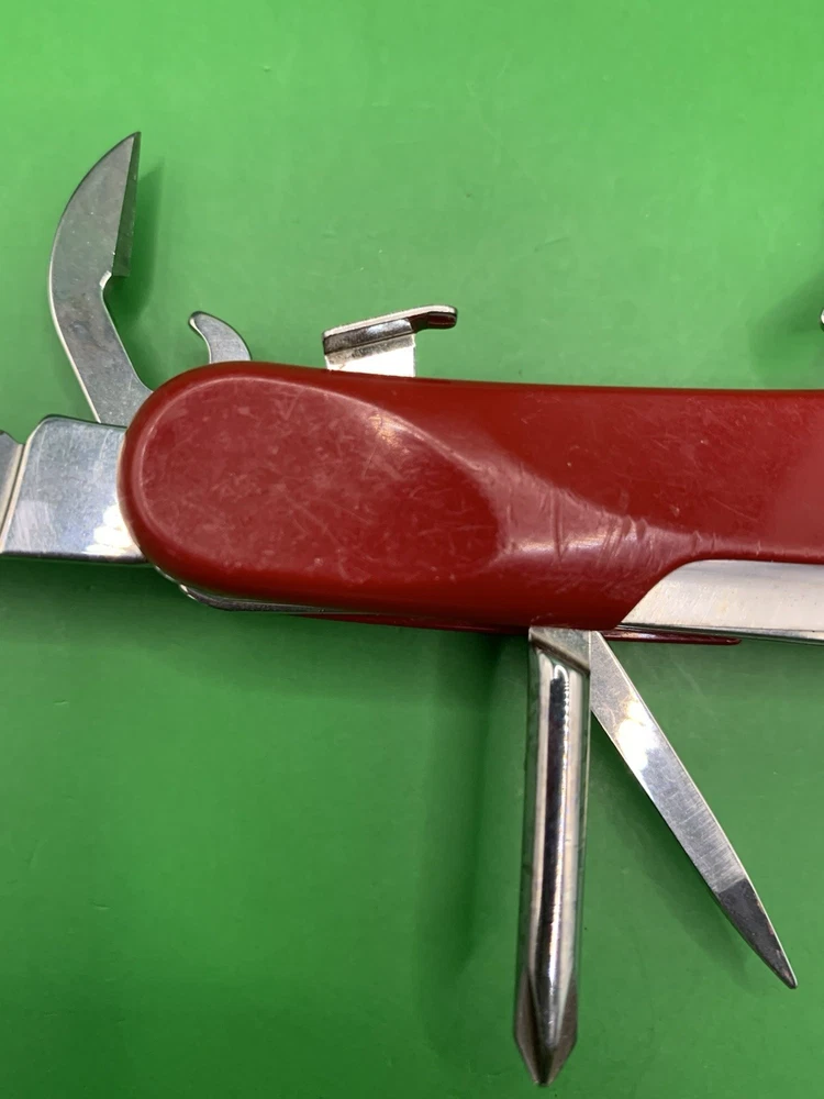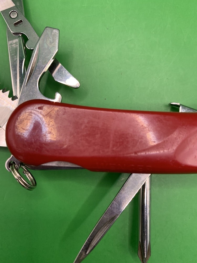 Used Wenger knife. Scales have some wear and the blades may need to be sharpened. The main blade doesn’t open smooth. There is something wrong with the locking system that makes it hard to retract and close the main blade. The main blade does lock into place when opened. All other tools open fine. See pictures for overall cosmetic condition. By purchasing you affirm that you are of legal age and aware of all applicable laws.