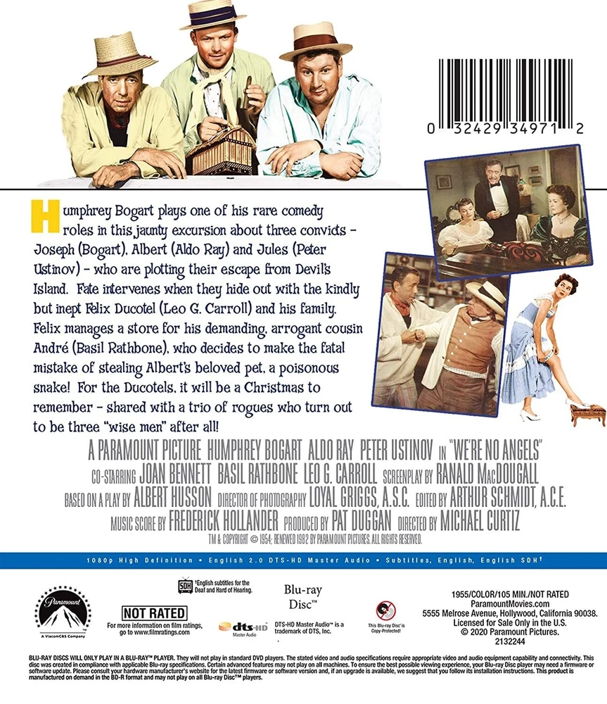 Further Details Title: We're No Angels (1955) Condition: New Description: For the first time on Blu-ray, Humphrey Bogart plays one of his rare comedy roles in this jaunty excursion about three convicts - Joseph (Bogart), Albert (Aldo Ray) and Jules (Peter Ustinov) - who are plotting their escape from Devil's Island. Fate intervenes when they hide out with kindly, but inept Felix (Leo G. Carroll) and his family. Felix manages a store for his arrogant cousin Andre (Basil Rathbone), who makes the fatal mistake of stealing Albert's pet, a poisonous snake. After resolving Felix's problems, the convicts return to prison, convinced that the world is much too wicked. Based on the play by Albert Husson. Format: Blu-ray Actor: Humphrey Bogart, Aldo Ray, Peter Ustinov, Joan Bennett, Basil Rathbone Genre: Comedy Rating: MPAA Not Rated No Of Discs: 1 Run Time: 1 hour and 45 minutes Studio: Paramount Language: English Subtitle Language: English EAN: 0032429349712 Region Code: Blu-ray: A (Americas, Southeast Asia...) Missing Information? Please contact us if any details are missing and where possible we will add the information to our listing.