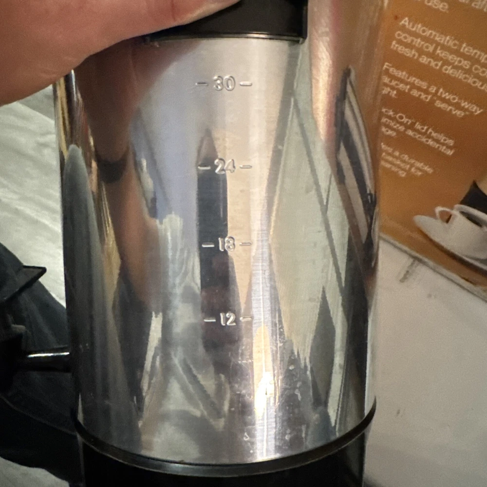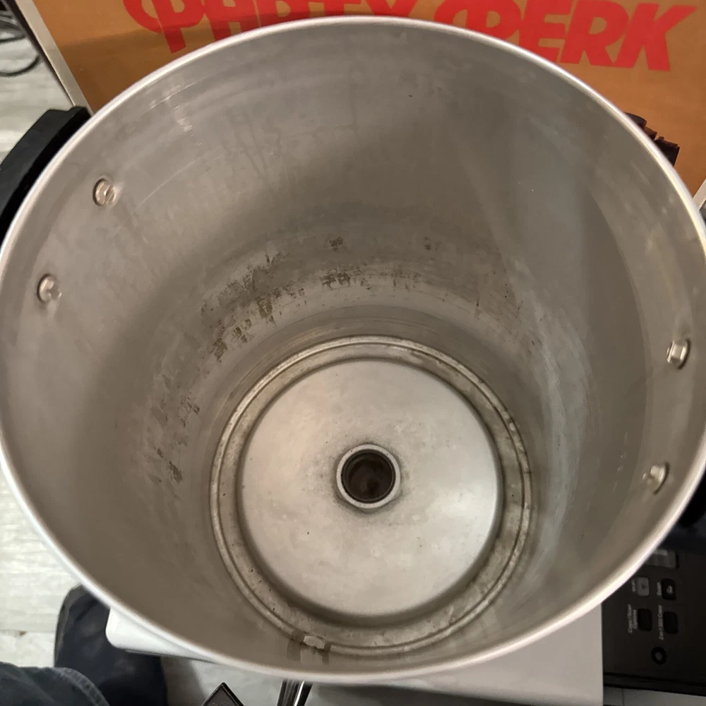 The West Bend #58030 Party Perk Automatic Coffee Maker is a vintage percolator that can brew 12 to 30 cups of coffee. It has a silver aluminum construction with features like a removable filter basket, two-way faucet, and locking lid. This coffee maker is designed for ground coffee and operates on electricity, with a shiny finish and a classic design.