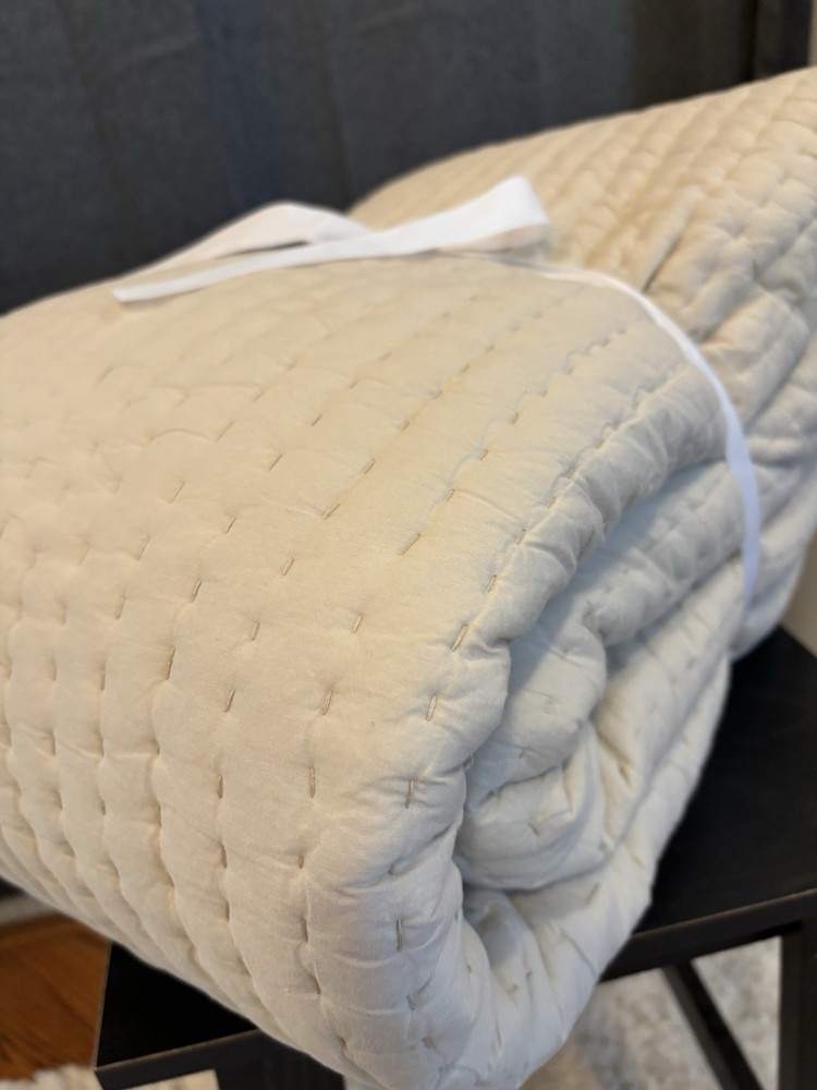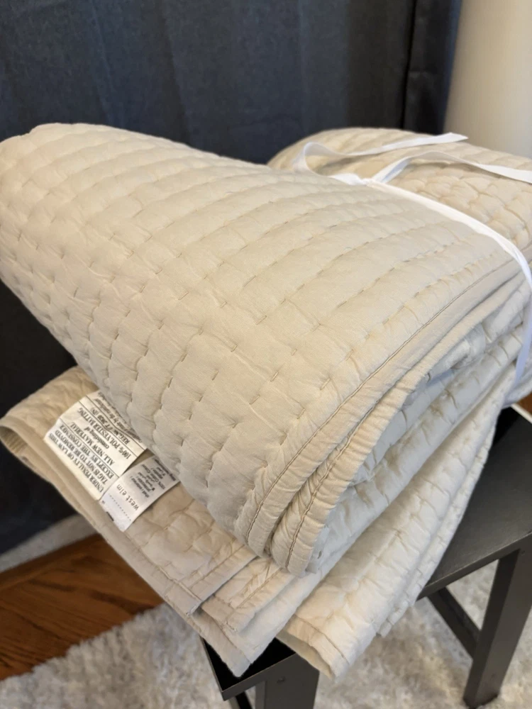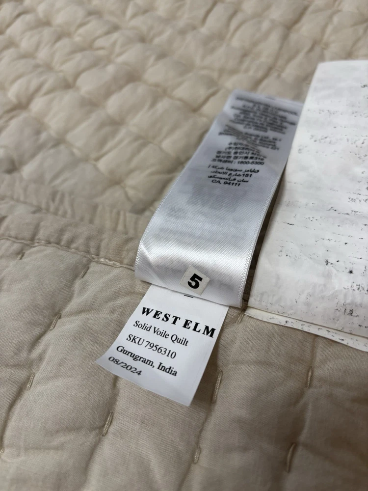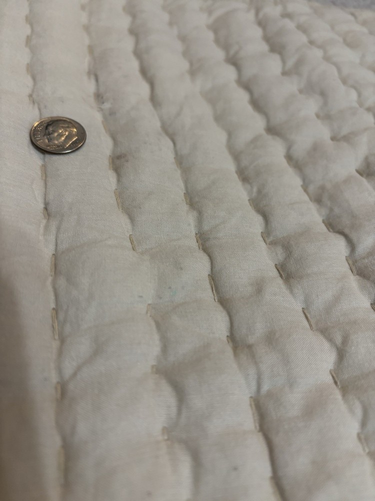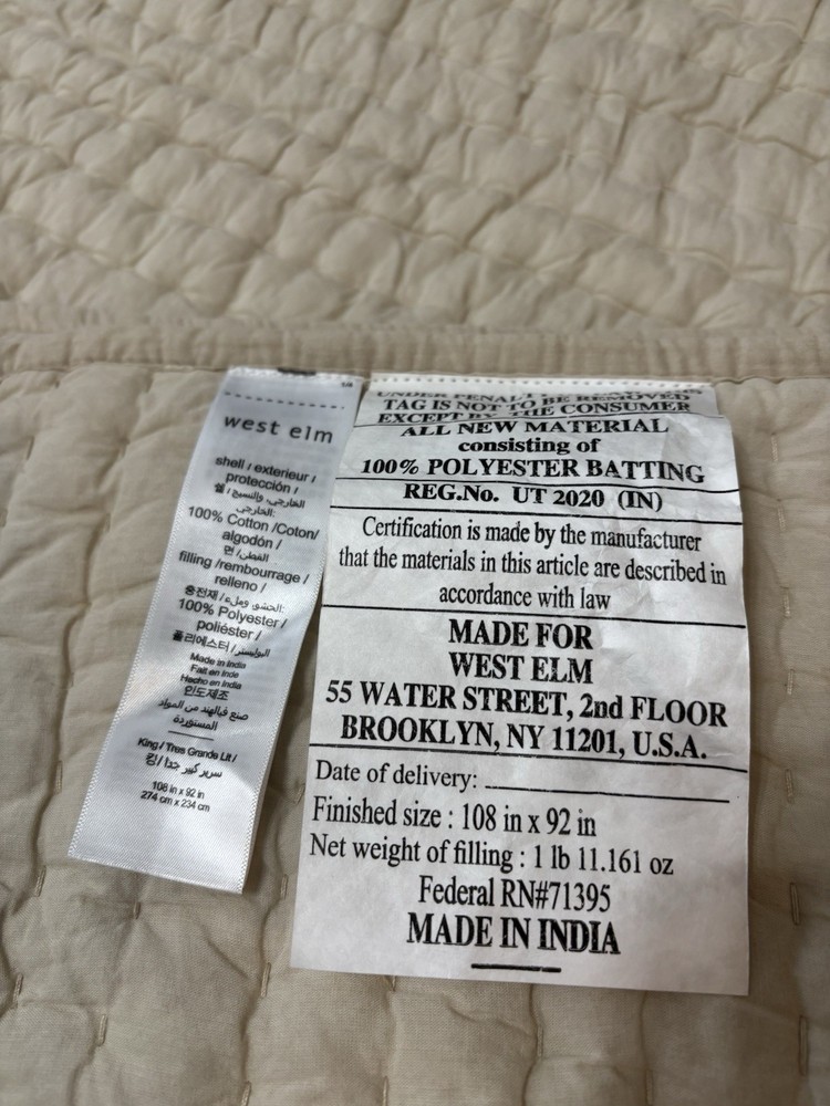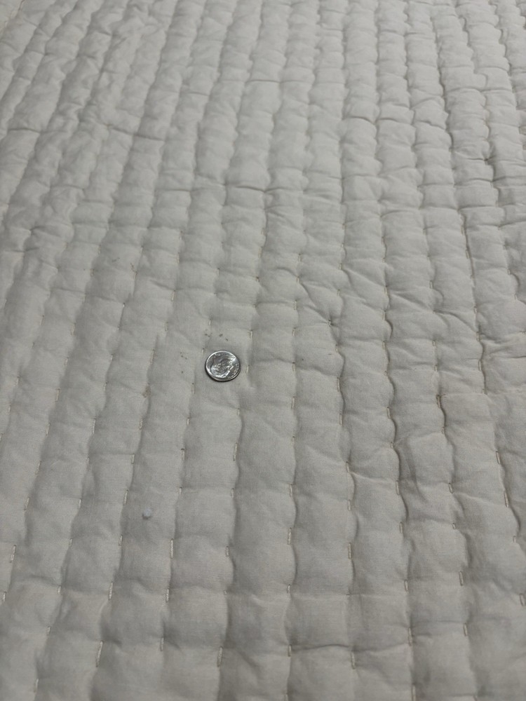 Color: Sand (beige) Size: King/Cal. King Quilt: 92"l x 108"w Shell: 100% cotton. Hand quilted. Quilt is pre-owned but in great condition except for a couple spots on one side as seen in photos.