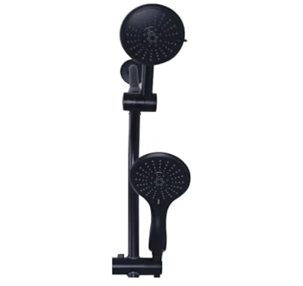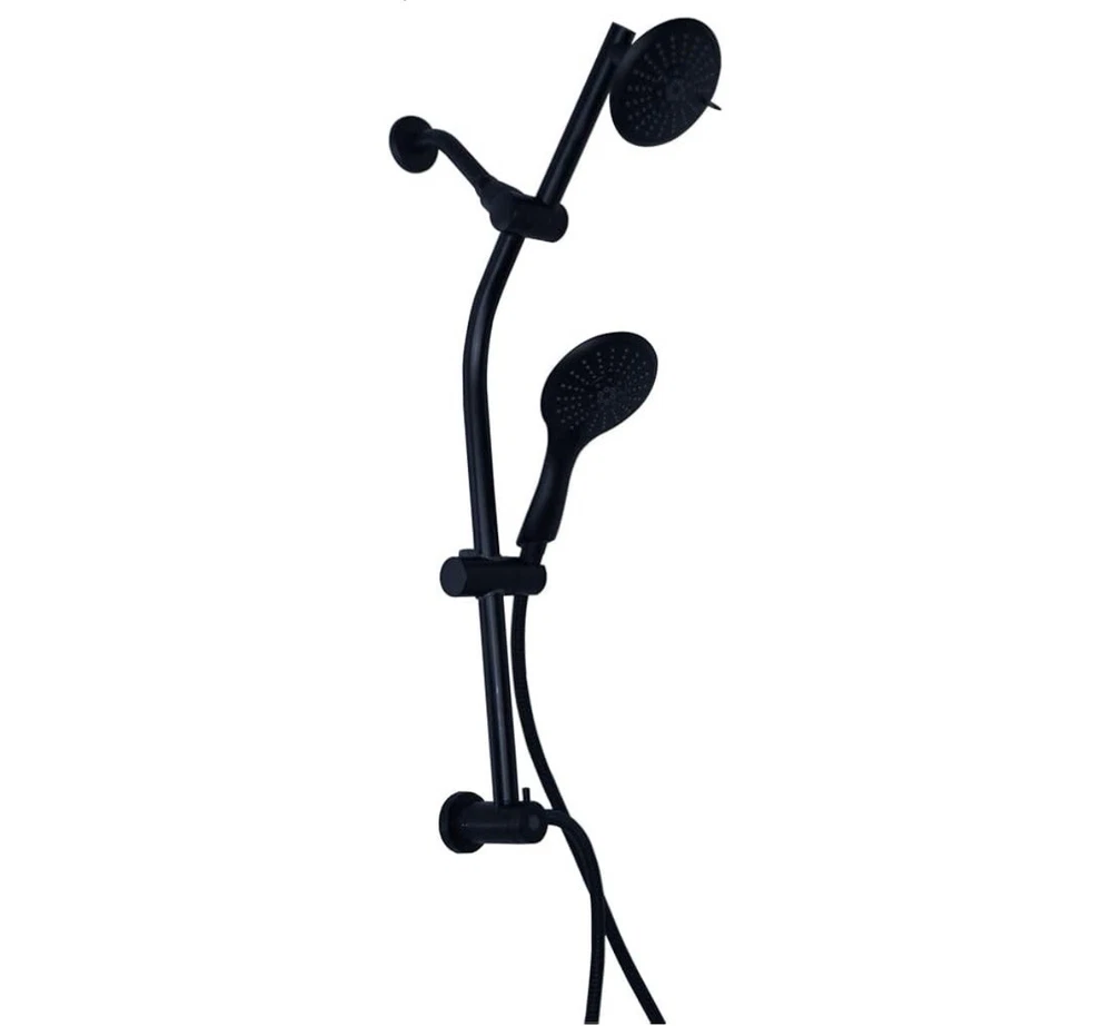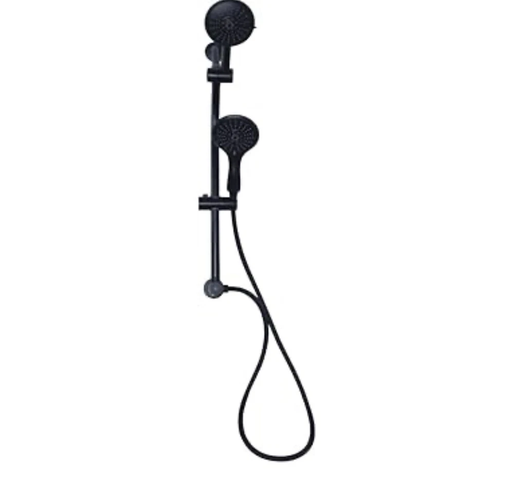 Westbrass Shower Head No Drill Conversion Slide Bar Adjustable Shower Sch800-62 21 in. drill-free slide shower bar with diverter for fixed shower head and hand shower installation to increase height with adjustability of shower head. Diverter diverts water between shower head and hand shower using a rotating valve. 1.8 GPM flow rate. Adjust the height of the shower head and the hand shower holder by sliding the tapered holders up or down the bar, no plumbing required Sleek thin round 5 in. diameter face, 5-Function spray fixed shower head easily adjusts vertically using a cam assembly and ball socket. Spray functions are: saturating, massage, saturating & massage, dot massage and saturating & dot massage 5 in. Face, 5-Function spray hand shower has optimum ergonomic angle for comfort and usability. Spray functions are: saturating, massage, saturating & massage, dot massage and saturating & dot massage 1/2 in. Shower hose outlet and tapered holder for hand shower 5 Ft. Stainless steel shower hose has 1/2 in. plated brass conical nut for hand shower with a plated brass knurled nut for shower outlet
