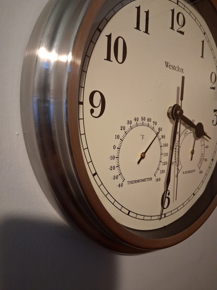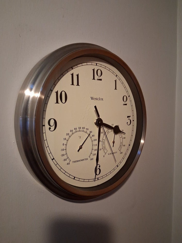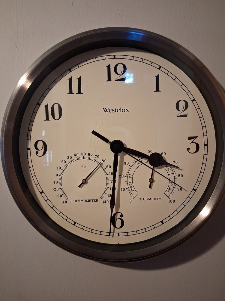 Westclox Wall Clock Silver Finish 12 in. Round Metal Frame Thermometer. Nice