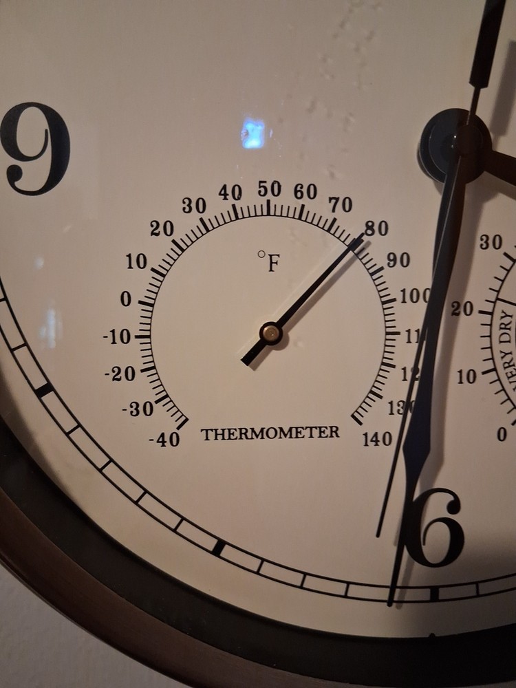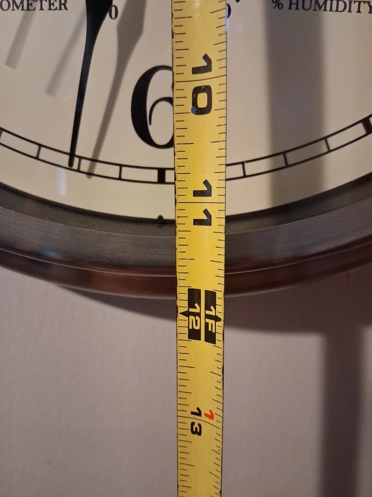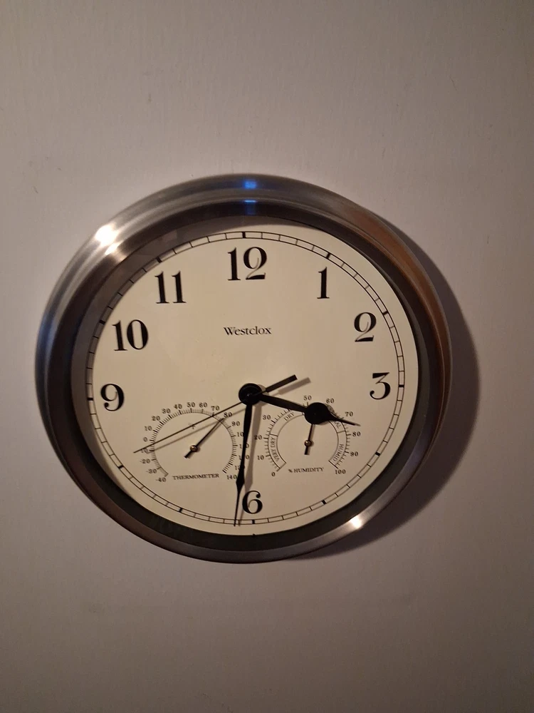 This Westclox Wall Clock features a sleek silver finish with a 12-inch round metal frame, adding a touch of classic elegance to any room. This hanging wall clock not only tells the time but also includes a thermometer feature for added functionality. Powered by batteries, the analog display is easy to read and the clock's metal construction ensures durability for years to come. Perfect for home décor enthusiasts looking for a versatile and stylish timepiece. Pre-owned like new tested and works see pictures for details perfect for outdoor or indoor use Nice display clock could make a great gift shipped right out USPS ground advantage