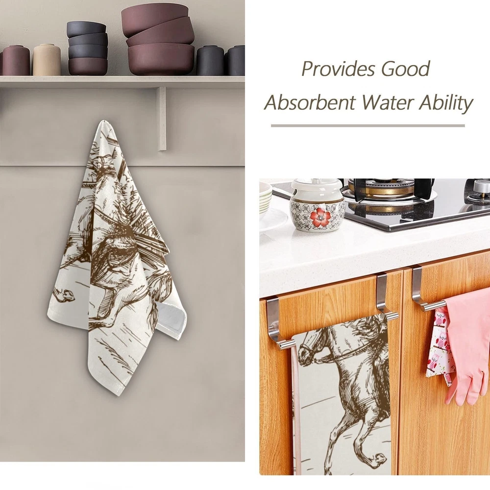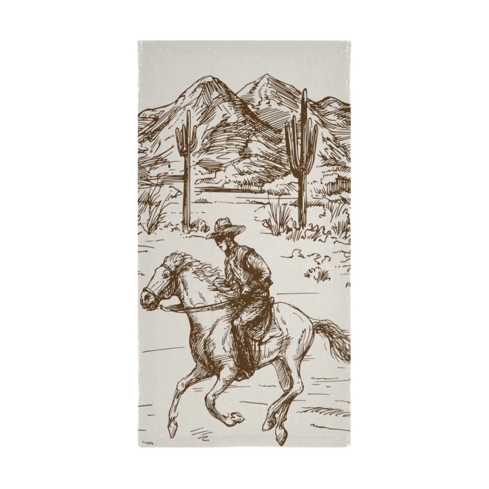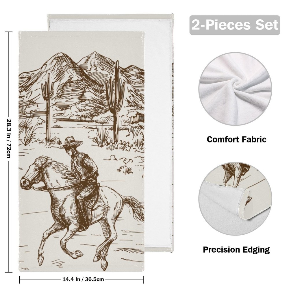 offers a range of highly absorbent and versatile towels set with various themes for you to choose from. Bring personality, fun, and addition to your space with the vibrant printing bathroom towels in home decor. You'll always find one that match perfect for you home decor. Package Include: 2 bath hand towels / 14x28 inches; Towel Material: The bathroom towels made by polyester microfiber front, white terry cloth back for quick drying. Lightweight, super soft and skin-friendly. Feature: Single-side printing towels with white terry cloth back; Super soft in touch, lightweight, quick drying; Reinforced edges to prevent unraveling; Vibrant colors with no fading; MULTI-USAGE: The bath hand towels are both functional and practical, can be used for a variety of purposes such as drying hands, face, hair, wiping dishes and decorative bathroom kitchen fitness. It can also be used as shower, guest, face, fingertip, hair, dishcloth, gym, spa and travel towel. The decorative bathroom hand towels are great gifts for housewarming, birthday, Christmas, Thanksgiving, holidays for women, men. EASY CARE: Our kitchen hand towels are machine washable. Wash with warm water less than 40℃. No iron and bleach. COWBOY TOWELS SET: The western towel set includes 2 brown cowboy hand towels of 14x28 inches, making them ideal for all your basic drying needs. ULTRA SOFT: These west desert cowboy kitchen towels are made of polyester microfiber and terry cloth. Soft enough for use on the face and strong enough for general household cleaning. Super soft and light-weighted. UNIQUE DESIGN: The american country cowboy bathroom towels are single-side printing towels. White terry cloth backing design enhanced highly absorbent and quick dry. Reinforced edges to prevent unraveling. Vibrant colors won't fade after multiple washes. Perfect addition to decorate kitchen sink, bathroom, guest bath, powder room. MULTI-USAGE: The western cactus bath hand towels are both functional and practical, can be used for a variety of purposes such as drying hands, face, hair, wiping dishes and decorative bathroom kitchen fitness. It can also be used as shower, guest, face, fingertip, hair, dishcloth, gym, spa and travel towel. The cowboy decorative bathroom hand towels are great gifts for housewarming, birthday, Christmas, Thanksgiving, holidays for women, men. EASY CARE: Our western horse kitchen hand towels are machine washable. Wash with warm water less than 40℃. No iron and bleach.
