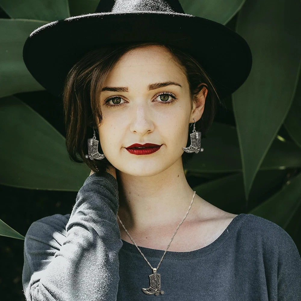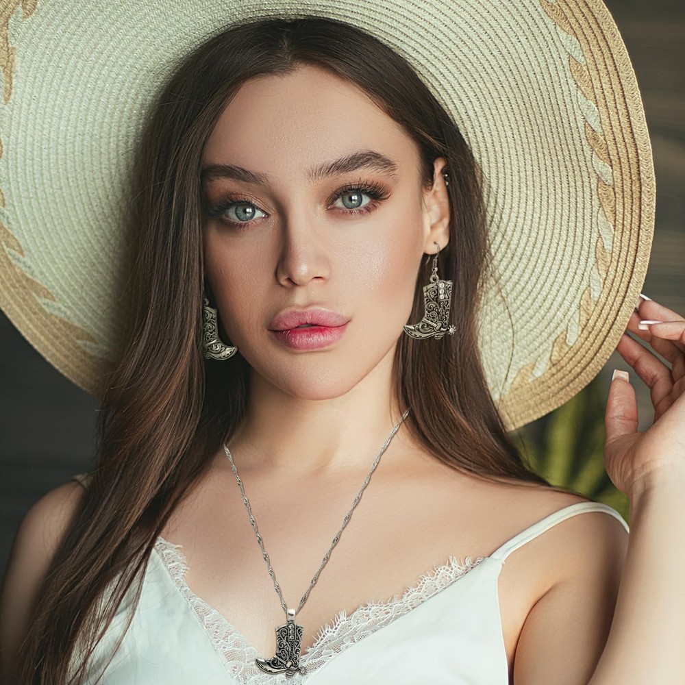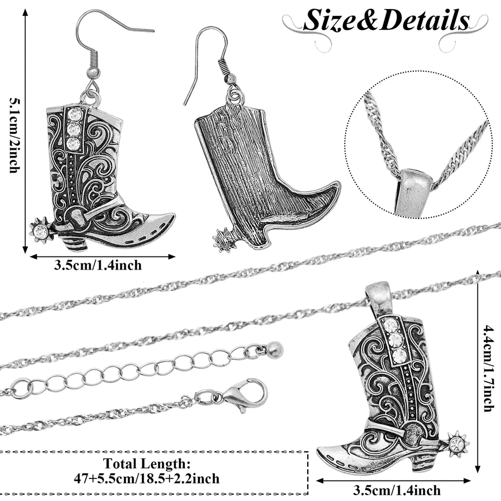 RechicGu Western West Cowgirl Cowboy Texas Boots Earrings Necklace Set, Spur Rodeo Drop Dangle Boots Earrings,Twist Link Chain Necklace with Boot Pendant,Jewelry Set Product Details Color: Boots Vintage Silver Set Brand: RechicGu MPN: Does not apply UPC: Does not apply EAN: Does not apply Department : womens Date First Available : March 18, 2024 Brand, Seller, or Collection Name: RechicGu Metal: alloy Material: Metal Gem Type: No Gemstone Chain: Twist Link Clasp: Lobster Clasp