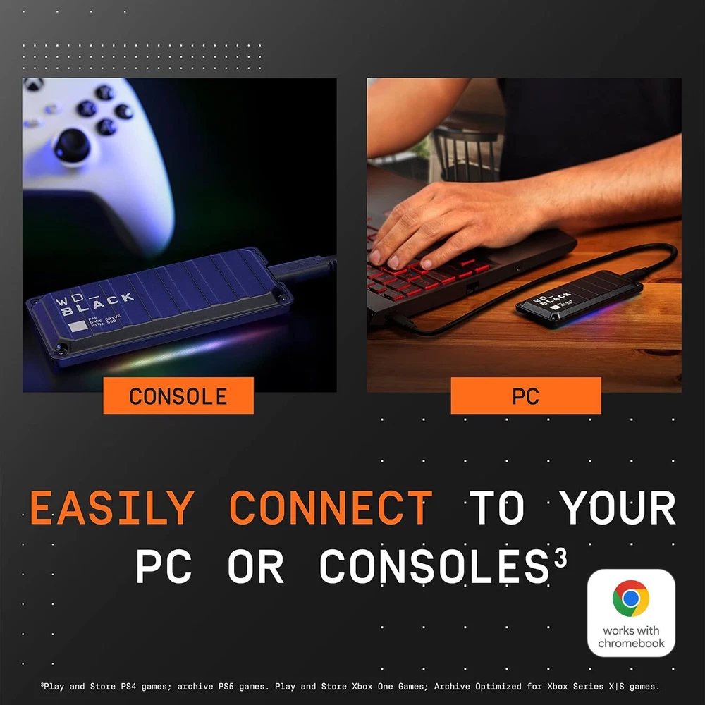 Dominate in style with the powerful P40 Game Drive SSD. The downloadable dashboard gives you full control over the LED light display for a personalized experience every time you play (Windows only). This high-performance SSD storage features blazing speeds in a compact and shock-resistant design, making it easy take with you anywhere. Customize your drive’s RGB lighting with the downloadable Dashboard (Windows only) to show off your style and make every play personal. Kick loading into overdrive with a USB 3.2 Gen2x2 interface and speeds up to 2,000MB/s. (Based on read speed. 1 MB/s = 1 million bytes per second. Based on internal testing; performance may vary depending upon host device, usage conditions, drive capacity, and other factors.) Compatible with PlayStation 5 and Xbox Series X|S consoles. {Compatible with PlayStation 4 Pro or PS4 with system software version 4.50 or higher, PlayStation 5 (Play and store PS4 games; archive PS5 games), Xbox One, and Xbox Series X|S (Play and store Xbox One games; archive Xbox Series X|S games).} Keep more of the latest and largest titles installed and ready to launch with capacities of up to 2TB. (1TB = 1 trillion bytes. Actual user capacity may be less depending on operating environment.) Built with toughness thanks to a shock-resistant structure, this durable drive can survive a drop of up to two-meters.