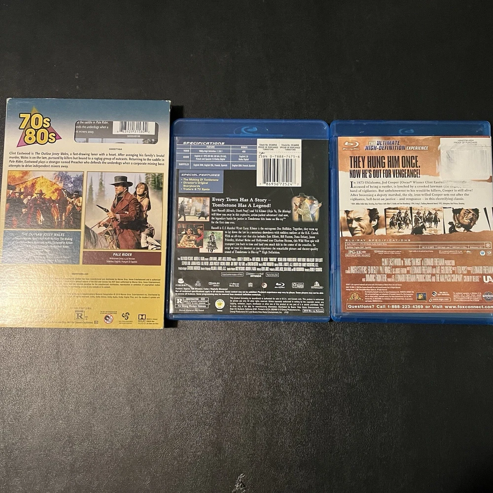 This lot has three cases with four movies Tombstone Hang Em High The Outlaw Josey Wales Pale Rider Outlaw Josey Wales and Pale Rider are in one DVD set Tombstone and Hang Em High are Blu-rays.
