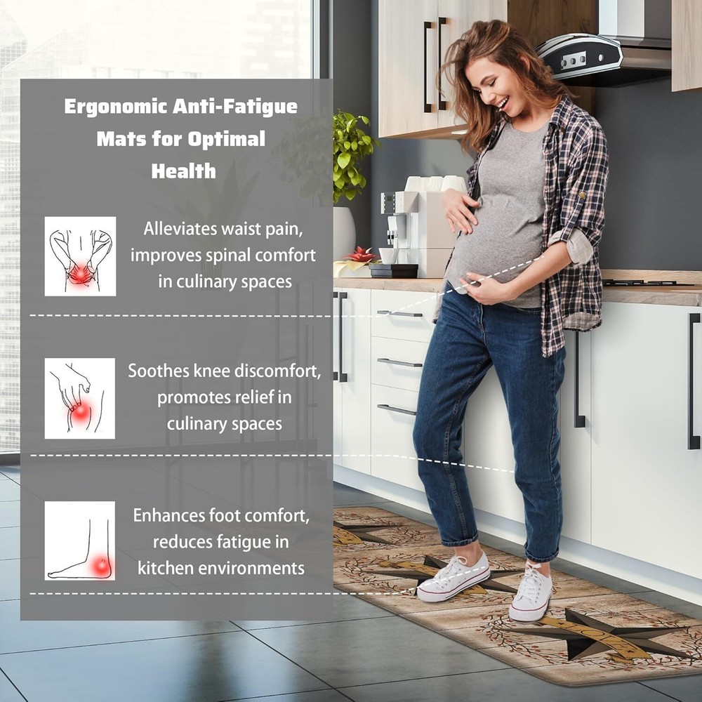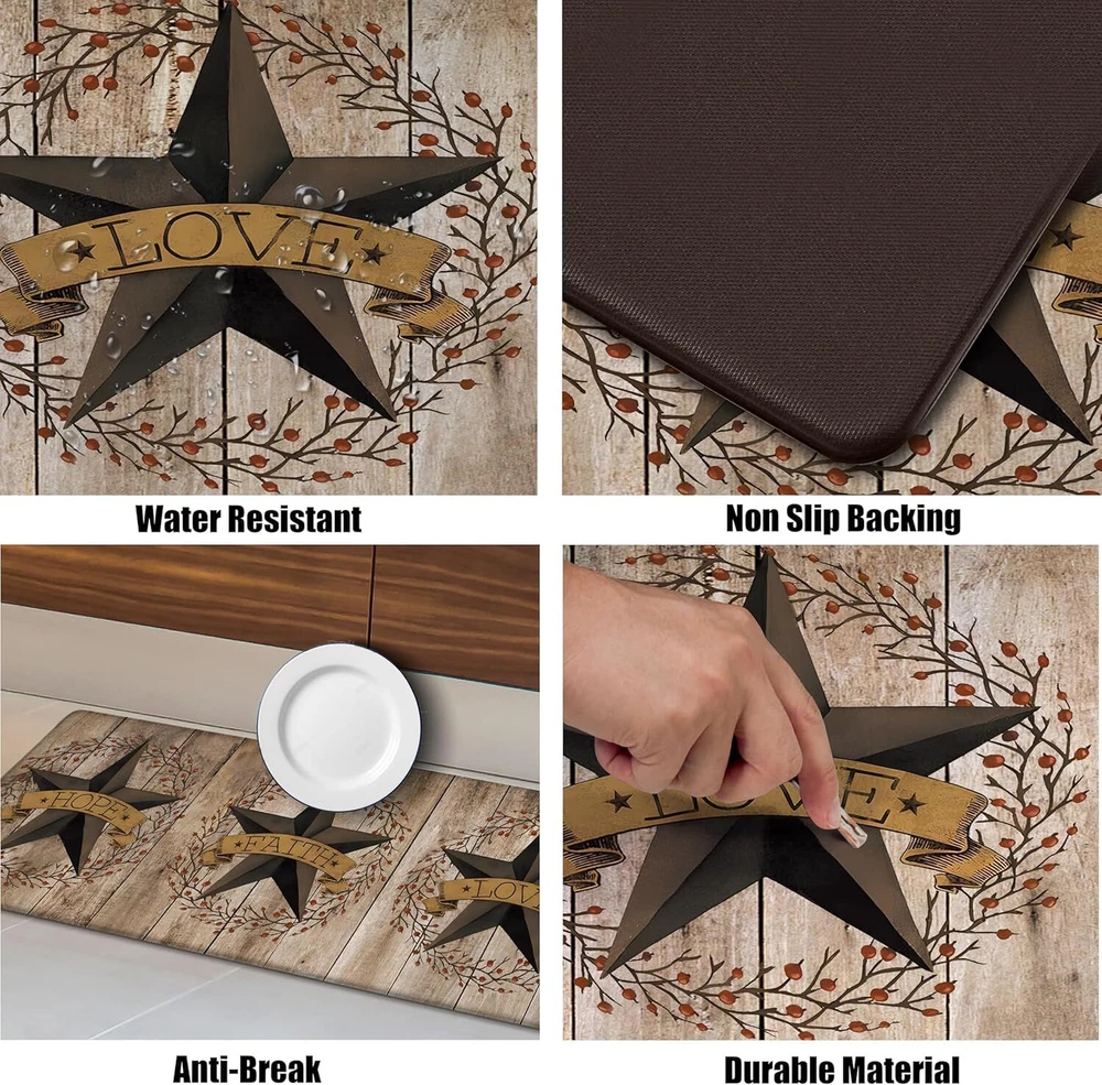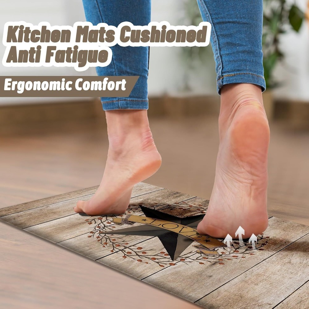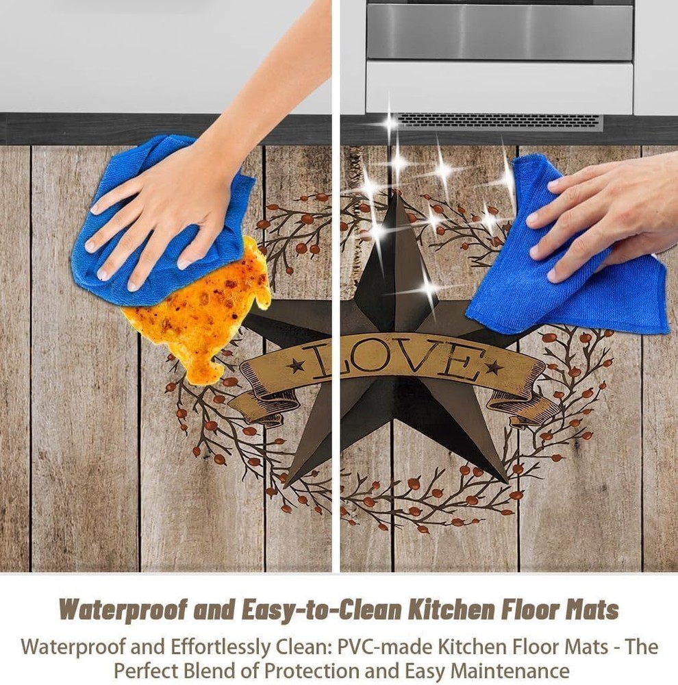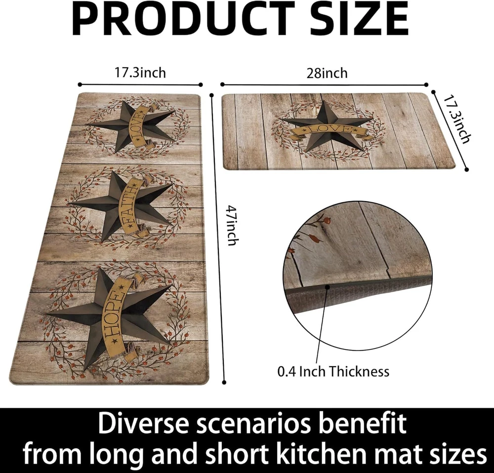 【Experience Ultimate Comfort】Step onto our anti-fatigue kitchen mats and feel the difference! Made with high-quality PVC and extra-thick (0.4 inch) foam, these mats provide a soft, cushioned surface that relieves foot, knee, and back pain caused by standing on hard floors. You'll feel like you're standing on a soft cloud! 【Stylish Rubber Kitchen Mat】The primitive aztec kitchen rug adopts digital printing technology to ensure that the pattern is vivid and not easy to fade. Decorative farmhouse wood soft kitchen rugs and mats are made of high quality with vibrant colors, which the good home decorations, perfect for birthdays and family parties. 【Perfect Fit for Any Space】Farmhouse style memory foam kitchen carpet mat set includes 1 small rug (17.3 x 28 inches) and 1 large rug (17.3 x 47 inches), making them the perfect size for most areas. Whether you need a mat for your laundry room, bathroom, or kitchen, these mats will fit perfectly and look great in any space! 【Easy to Clean and Maintain】Western heavy-duty non-skid kitchen mats and rugs are designed to repel water, liquids, oils, and stains, making them incredibly easy to clean. Simply wipe dirt off with a damp cloth or use a hand-held vacuum to keep them looking like new! 【WARNING!!】Open rug fully and place on even, flat, dry floor. Water under rug may result in slippage. Rug must be placed on dry surface during use.
