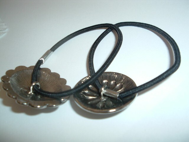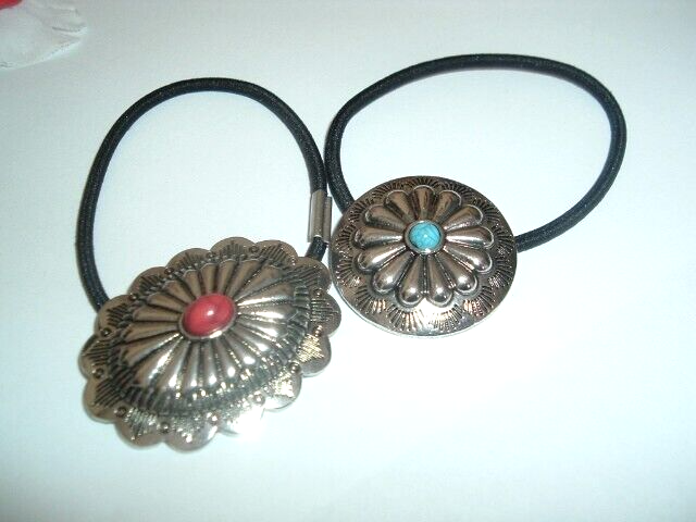A pair of ponytail holders with silver conchos, one with faux turquoise and one with coral and both have black elastic stretch bands for your ponytail. Never worn, condition is excellent, fun to wear. We combine ship.