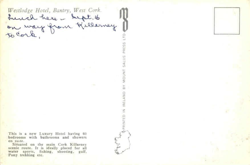 MAKE AN OFFER. THE MORE YOU BUY THE BETTER DEAL I WILL ACCEPT The postcard advertises the Westlodge Hotel in Bantry, West Cork, which is described as a new luxury hotel with 60 bedrooms featuring en suite bathrooms and showers. The hotel is located on the main scenic route between Cork and Killarney, making it convenient for travelers.