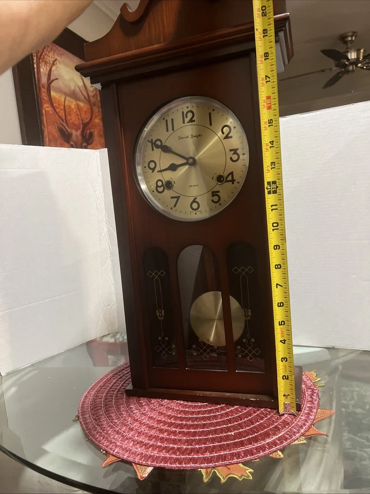 Vintage Westminster Chime Clock by Daniel Dakota Tempus Fugit. This clock features a dark cherry wood frame with a rectangular shape. It is a mechanical clock powered by a 35-day movement. The clock displays analog time and chimes in the Westminster sequence. The clock is a bracket style, suitable for any room, and has a retro/vintage design. Made in Korea, Republic of, this original clock is signed by the brand. Texted and works good Look at the pictures amd ask questions before making your purchase