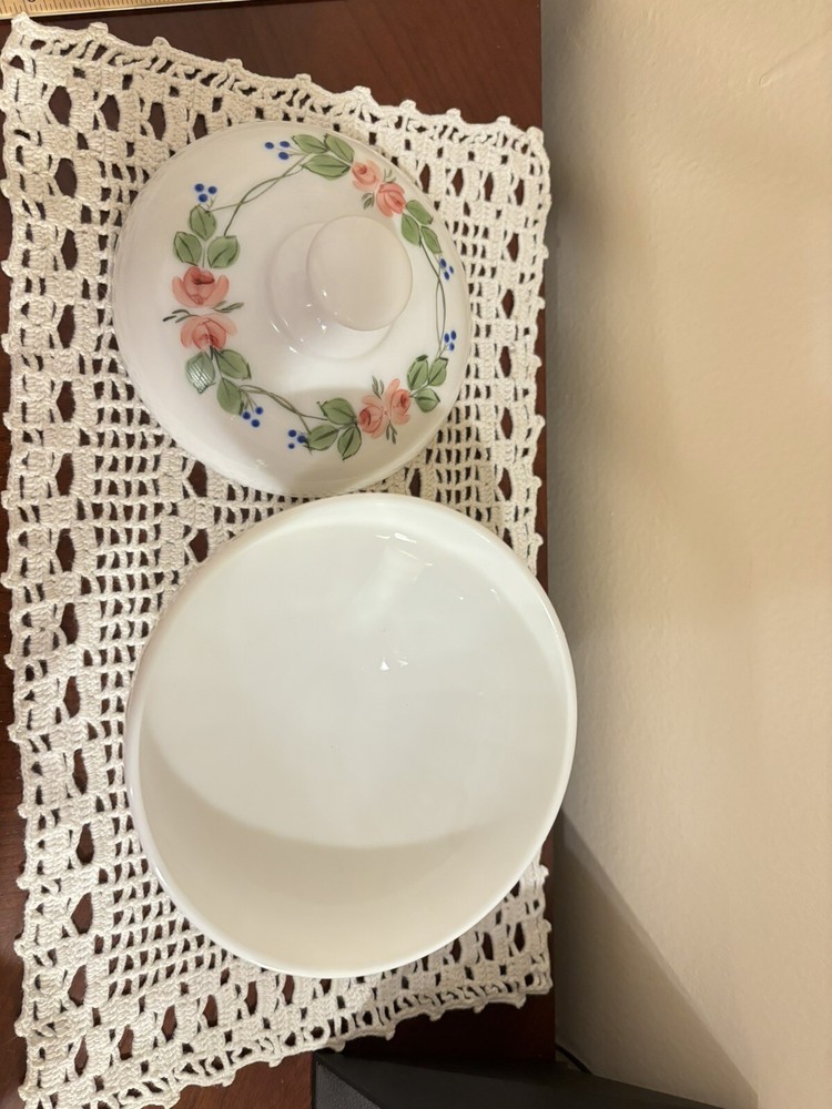 This beautiful candy dish is a vintage piece from Westmoreland, a well-known brand in glassware. The dish is made of white glass and features intricate hand-painted designs that make it a unique addition to any collection. It's perfect for storing candies, small treats, or even as a decorative piece. The dish is in excellent shape and ready to be displayed in your home. Good condition. No chips and crack. Please view all pictures for details.