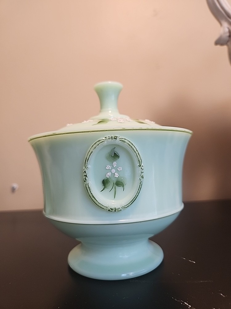 This vintage Westmoreland candy dish is made of green opaque glass in the Jadeite style. It features handpainted details and a covered design. The dish has one compartment and is artist signed. Produced between 1970-1979, this collectible piece is a beautiful addition to any home decor. 5" Round x 5-1/2" High