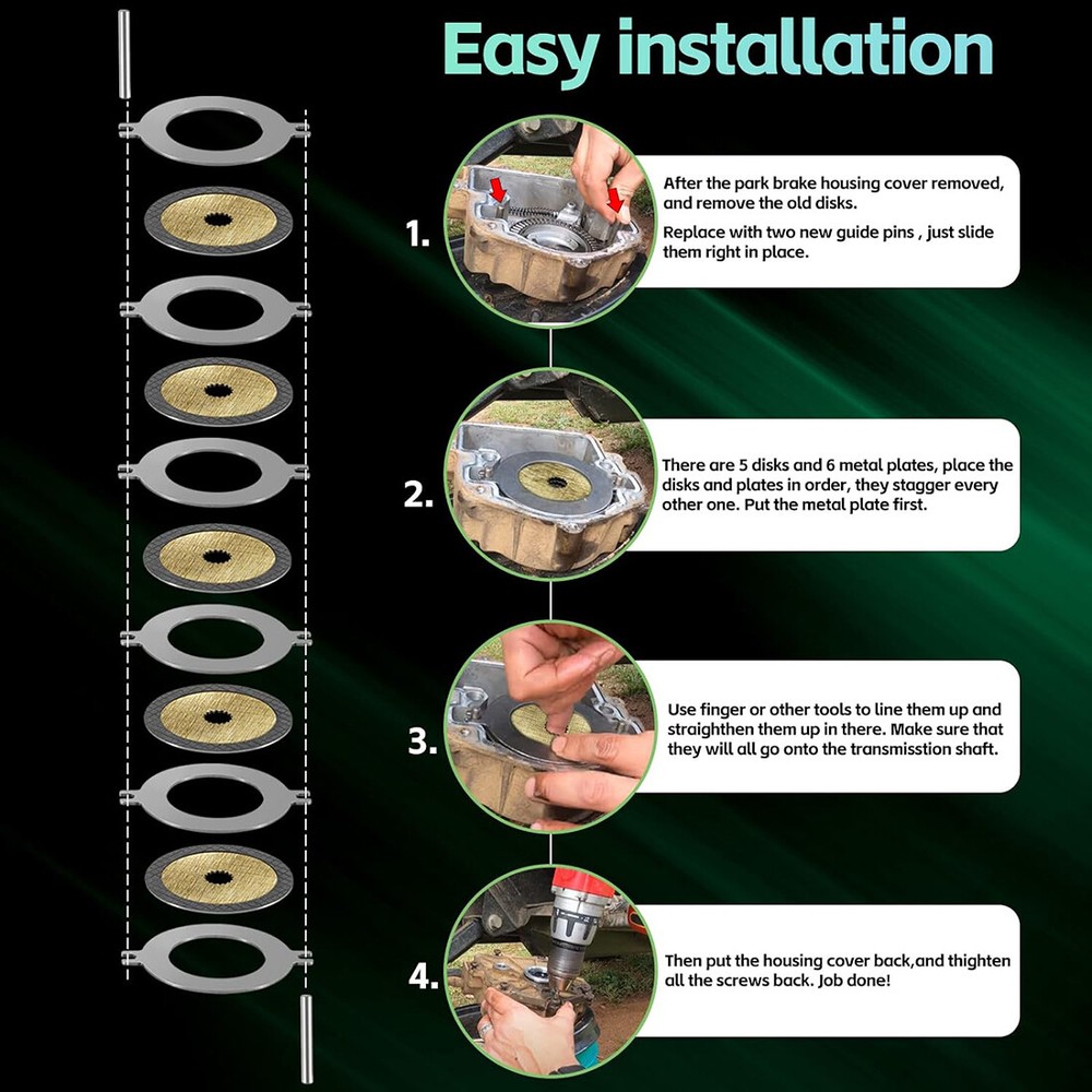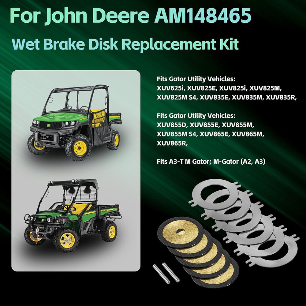 Fitment: This Wet Brake Discs Kit is suitable for John Deere Gator Utility Vehicles XUV625i, XUV825E, XUV825i, XUV825M, XUV825M S4, XUV835E, XUV835M, XUV835R, XUV855D, XUV855E, XUV855M, XUV855M S4, XUV865E, XUV865M, XUV865R, A3-T M Gator; M-Gator (A2, A3) Features: 1) Wet brake is usually used as a park brake/ emergency brake on heavy machinery. We should maintain the wet brake system by replacing the worn-out wet brake disks, to strengthen the park brake ability, quick response, and keep safe driving 2) This wet brake disk kit is a direct replacement for JD OEM parts: AM148465, AM140803. Manufactured with original data, make sure it is a perfect fitment 3) Our park brake discs are constructed with high-standard steel material, resistant to rust, and corrosion to work in severe conditions. Meet your needs and be reliable Package included: Wet Brake Discs Kit