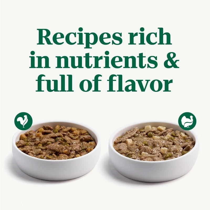 Nutro Recipes are centered around high-quality protein sources and wholesome ingredients rooted in nature. Every bowl provides essential nutrition for whole-body health to help grow healthy dogs. Nutro Natural Choice Cuts In Gravy Wet Dog Food Chicken Turkey Variety Pack comes with 2 recipes: Nutro Natural Choice Cuts In Gravy Wet Dog Food Chicken Recipe and Nutro Natural Choice Cuts In Gravy Wet Dog Food Turkey Recipe. These recipes provide your dog with real chicken or turkey as the #1 ingredient for a delicious flavor they will enjoy. These wet dog food recipes are formulated without grains and are made in our USA facilities with the finest ingredients from around the world. These facilities have zero factory waste to landfill and use 100% renewable electricity. Nutro Cuts In Gravy is made with non-GMO ingredients and has no chicken by-product meal, corn, wheat, or soy. Give your dog food that fuels their vitality with Nutro Wet Dog Food Recipes. Made with real chicken or turkey as the #1 ingredient. This wet dog food is formulated without grains. Made in facilities with zero factory waste to landfill and uses 100% renewable electricity. Made with non-GMO ingredients; no chicken by-product meal, corn, wheat, or soy. Premium natural dog food plus vitamins, minerals, and other nutrients.