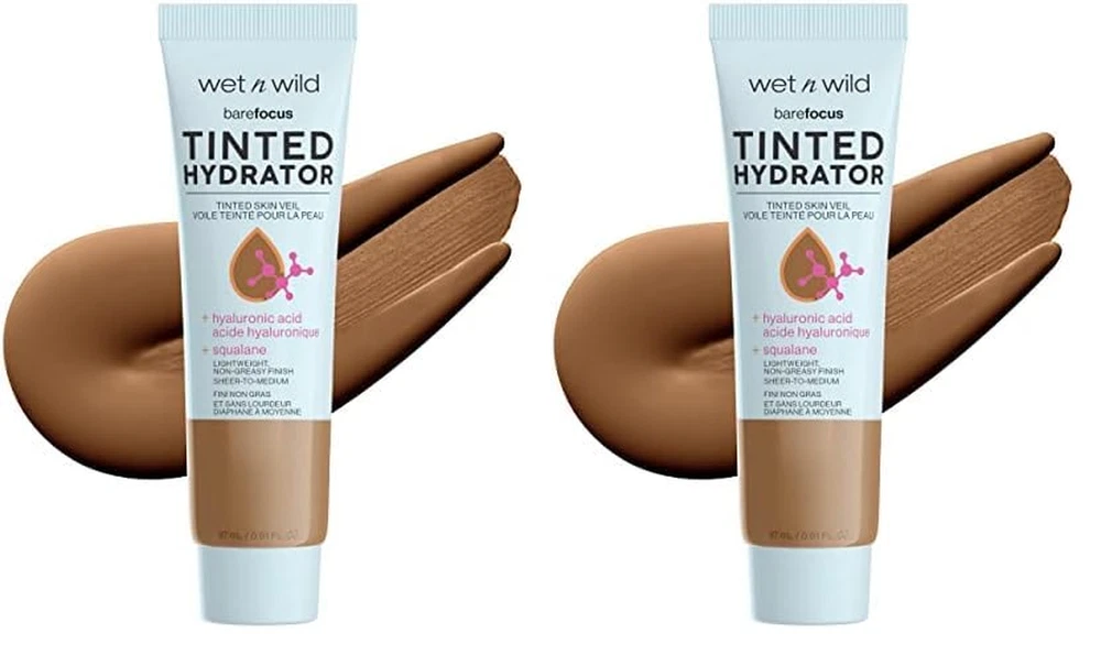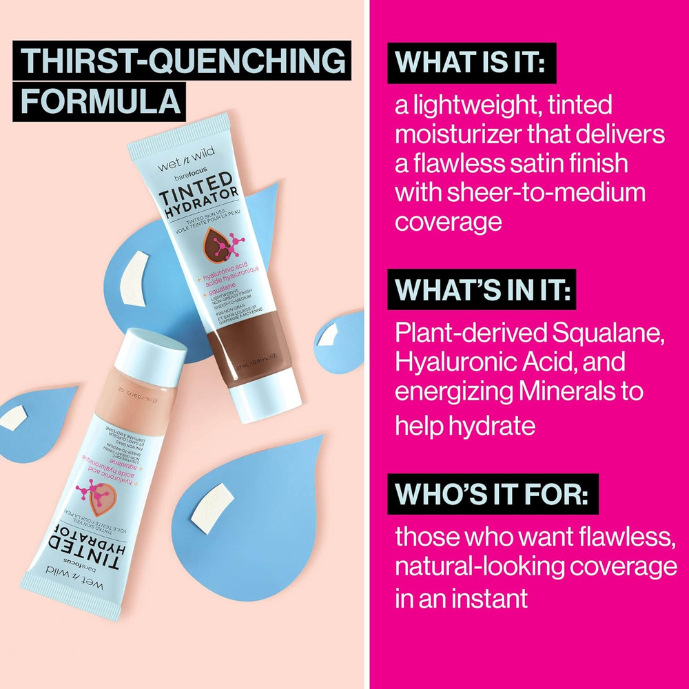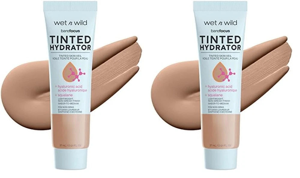 Buildable Coverage: Watch as lines and imperfections fade away. This lightweight hydrator features buildable seamless coverage from sheer to medium. Intensely Hydrating: A dream come true for normal and dry skin, this tinted hydrator is lightweight, moisturizing, and nourishing, leaving your skin happy and beautiful. Semi-Matte Finish: Improve your complexion in an instant while achieving a soft semi-matte finish that leaves a perfect base for any makeup routine. Multiple Shades: With so many colors available, it's easy to find a perfect color match for your unique skin tone. Cruelty-Free: wet n wild products are never tested on animals and are always cruelty-free. More than just a moisturizer, the Bare Focus Tinted Hydrator Tinted Skin Veil perfects with sheer-to-medium coverage, while granting your skin some seriously intense hydration. Formulated with hyaluronic acid and vegan squalane, this is a one-way ticket to quenched perfection! Buildable with a semi-matte finish, this two-in-one miracle creates a naturally flawless and nourished glow. Use it to transform a multi-step routine into a one-step regimen, so you’ll be ready in a splash with this lightweight, multipurpose, and super convenient formula. If that’s not a beauty dream destination, we don’t know what is! Simply tap, blend and build to your preferred coverage for hydrated, radiant, instant perfection. Select from our versatile range of shades to transport yourself to complexion paradise! wet n wild starts as everyone’s first and remains a lifelong destination for vibrant and accessible beauty. Delivering over 40 years of trend-forward and all-inclusive innovations, we are your trusted beauty expert that will keep you looking fabulous without ever betraying your budget. From the bold ‘n’ bright to the neutral ‘n’ nuanced, we set out to spoil you with options while setting the gold standard of achievability. So go ahead, get your feet wet with us again and go wild with your imagination!