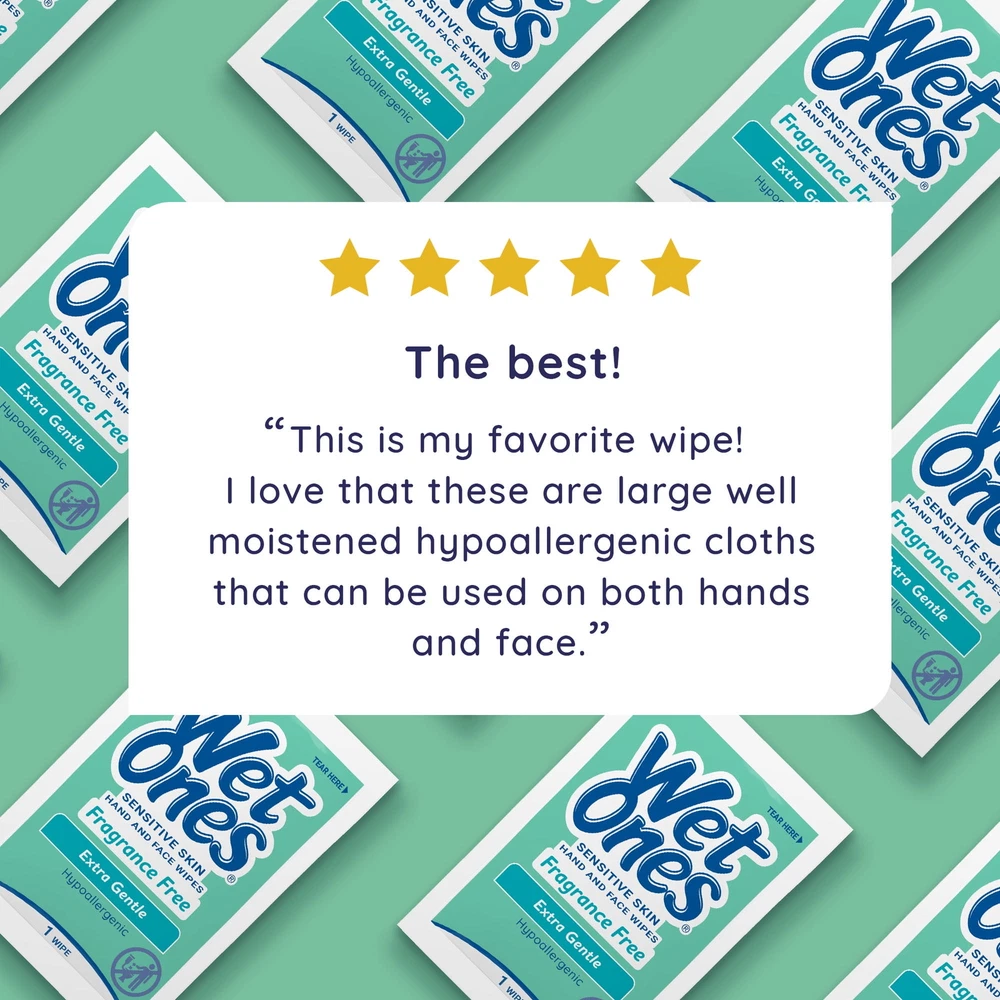 With Wet Ones individually wrapped hand and face wipes, you can always keep skin that feels smooth, soft, and clean within reach. Our travel-ready wipes make it easy to quickly wipe away dirt and messes from hands and face. Plus, pediatrician tested, hypoallergenic, and paraben free, these unscented pocket size single wipes won’t leave behind a sticky residue. Just slip some singles into your lunch box, pocket, or purse before leaving the house, so you’re always ready for whatever life brings. Tough on dirt and gentle on skin, Wet Ones is America’s #1 Hand Wipe Brand**. Wet Ones Sensitive Skin Hand Wipes, Fragrance Free/Unscented, 24 Ct Singles 6 Pack, 144 Total Wipes. **IRI Custom EPC Model, TUS MULO; 52 WE 3-19-23 INDIVIDUALLY WRAPPED WET ONES SINGLES, perfect for pockets, lunchboxes, sports bags, backpacks and more TSA-APPROVED fragrance-free wipes HAND & FACE WIPES that take care of dirt and messes — Without leaving skin feeling dry or sticky POCKET-SIZED HAND WIPES individually wrapped to go anywhere HYPOALLERGENIC AND PEDIATRICIAN TESTED INDIVIDUAL HAND & FACE WIPES — Tough on messes and gentle on skin WET ONES HAND WIPES are America’s #1 hand wipe brand** ALSO AVAILABLE IN 40-count Canisters and 20-count Travel Packs Wet Ones Sensitive Skin Hand Wipes, Fragrance Free/Unscented, 24 Ct Singles 6 Pack, 144 Total Wipes