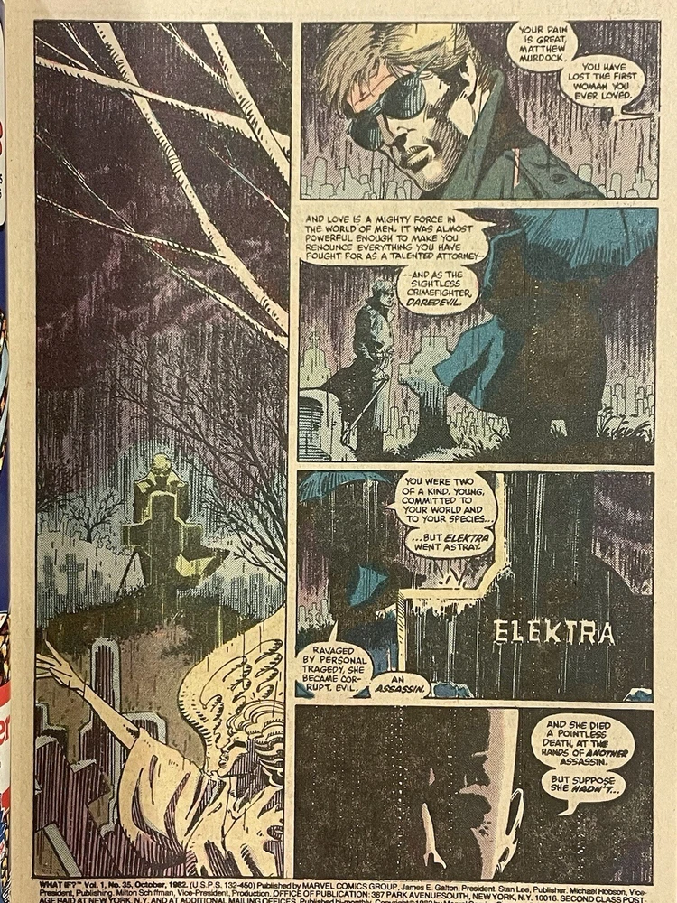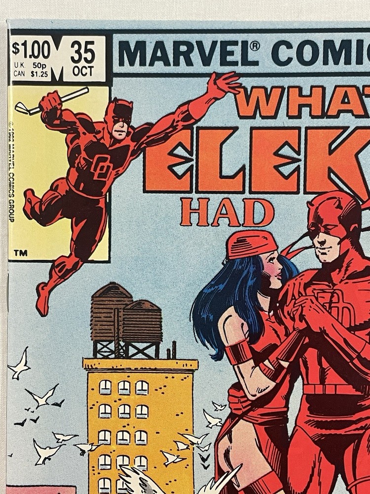 Publisher: Marvel Comics Features: Direct Genre: Superheroes Era: Bronze Age (1970-83) Tradition: US Comics Cover Artist: Ed Hannigan, Terry Austin Issue Number: 35 Character: Kingpin, Uatu the Watcher, Yellowjacket (Hank Pym), Elfqueen, Cat People Flavius, Tigra (Florence), Bullseye, Balkatar (Tegnar), Orann, Yanthon, Elektra, Foggy Nelson, Wasp, Thor, Tigra, Eric Slaughter, The Avengers Iron Man (Tony Stark), Ebrok (Death), Helene, Jarvis, Becky Blake, Daredevil (Matt Murdock), Captain America (Steve Rogers) Superhero Team: Avengers Publication Year: 1982 Language: English Artist/Writer: Sal Trapani, Don Warfield, Steve Ditko, Glynis Oliver, Roger Stern, Greg Larocque, ? [As and Crew], Christie Scheele, Mike Esposito, Terry Austin, Frank Miller, Alan Zelenetz Series Title: What If?