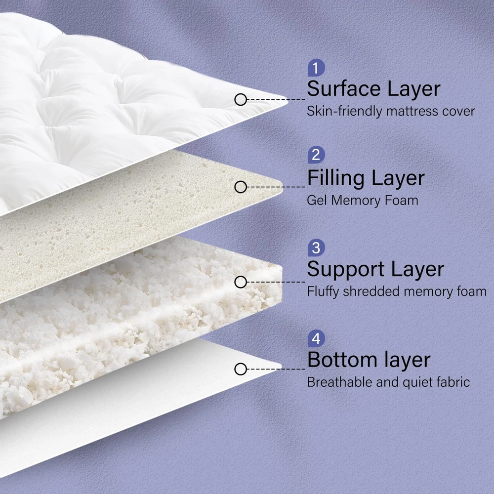 WhatsBedding 4 Inch Memory Foam Mattress Topper Queen for Back Queen, White LuxeFusion Product Description Features 【Good support, fluffy and soft】 Skin-friendly breathable mattress cover, Combines the softness of Gel memory foam with the support of shredded memory foam, enhanced pressure relief and breathable surface for comfortable sleep. 【Ergonomic design】Fits the body curve to relieve pressure and pain. While ensuring support, it provides enough softness, bringing cloud-like comfort, balanced support and effective pressure relief, allowing you to sleep more soundly and relax. 【Stable anchor elastic straps】4 stable anchor elastic straps ensure a secure fit, keep it at the place no matter how you toss or turn on bed. 【New dot quilting design】This mattress topper is made of high-quality fabrics and New dot quilting technology to ensure that the filling is evenly distributed and prevent lumps after long-term use. 【Warm Tips】Our mattress topper is vacuum compressed and packed. Due to the lack of air, it may not look thick enough after opening. Please pat the mattress cover gently and let it stand for 24 hours to achieve the best fluffiness. Whatsbedding focuses on customers' shopping experience. If you have any questions or concerns, please feel free to let us know! Product Details Free Shipping All orders ship free and fast to your doorstep. Easy Returns Satisfaction guaranteed. 30-day returns, no questions asked. 24/7 Support Contact us anytime; we’re here to help, day or night. Brought to you by LuxeFusion – Quality you can trust.