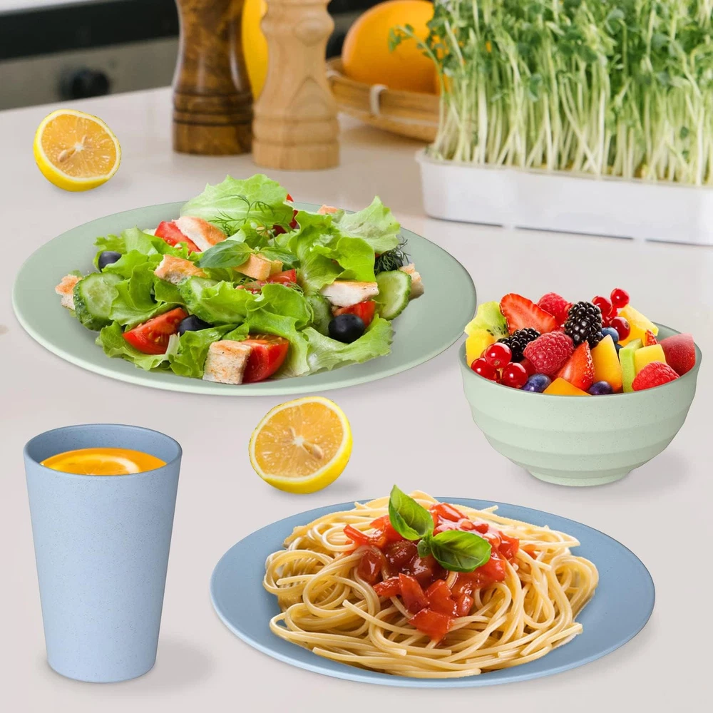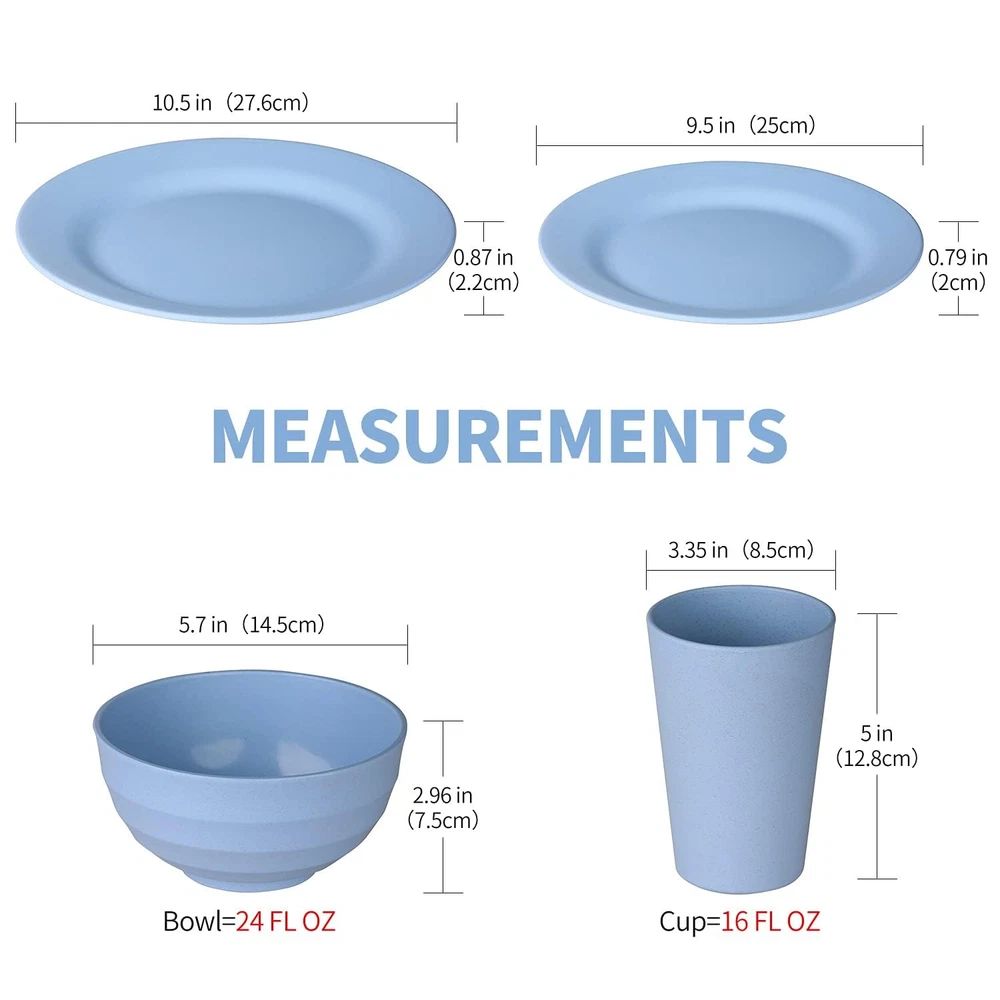 Plastic Dinnerware Set for All Occasions: This 16-piece dinnerware set includes 4 pieces each of 10.5-inch dinner plates, 9.5-inch salad plates, 5.7-inch (24 Fl Oz) plastic bowls, and 3.35-inch (16 Fl Oz) blue plastic cups. Safe and Non-Materials: Made from natural organic wheat straw fiber and BPA-free, food-safe PP materials, this dinner dishes set is a healthier choice for your family and environmentally sustainable. Ideal for parties, picnics, camping, and daily use at home, school, or the office. Lightweight and Durable: These wheat straw plates, dishes and blue cups are light, easy to handle, and far more durable than ceramic and glass, making them perfect for all ages and every meal, from breakfast to dinner. Versatile Usage: Perfect for serving a variety of meals, including pasta, sandwiches, bread and butter, desserts, soups, rice, salads, and appetizers, these plates, plastic dishes and bowls sets will enhance your dining experience with their aesthetic appeal. Space-Saving Dinnerware Set: The stackable design of this plates and bowls dinnerware set ensures compact storage in your kitchen cabinet or dish rack, preventing toppling and saving space.