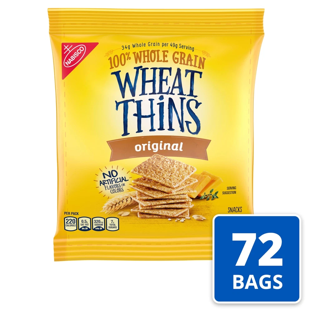 << The item is a Size 1.75 Ounce (Pack of 72) >> There’s nothing like the satisfying crunch of original Wheat Thins. The nutty, whole grain flavor makes these snack crackers the ideal cracker companion to dips, spreads and toppings. Baked with 100% whole grain wheat, these thin whole grain crackers have the crunchy texture and salty taste you love without artificial colors or flavors. Each serving of these cracker snacks has 21 grams of whole grains, with no cholesterol or high fructose corn syrup, making these crackers ideal whole grain snacks for kids and adults. Wheat Thins crackers are great holiday party snacks; pair these snack crackers with cheese, fruit or meat to create a delicious charcuterie board or enjoy them all on their own. These wheat crackers are perfect for pairing with 1.75 Ounce (Pack of 72) There’s nothing like the satisfying crunch of original Wheat Thins. The nutty, whole grain flavor makes these snack crackers the ideal cracker companion to dips, spreads and toppings. Baked with 100% whole grain wheat, these thin whole grain crackers have the crunchy texture and salty taste you love without artificial colors or flavors. Each serving of these cracker snacks has 21 grams of whole grains, with no cholesterol or high fructose corn syrup, making these crackers ideal whole grain snacks for kids and adults. Wheat Thins crackers are great holiday party snacks; pair these snack crackers with cheese, fruit or meat to create a delicious charcuterie board or enjoy them all on their own. These wheat crackers are perfect for pairing with spinach and artichoke dip or for creating stacks of cheese and crackers you can enjoy at home or work. Each Wheat Thins bulk cracker box is sealed for freshness and ready to share. Includes seventy-two 1.75 oz snack packs of Wheat Thins Original Whole Grain Wheat Crackers (packaging may vary)||Nutty, whole grain flavor gives these snack crackers a salty-sweet taste||Each serving has 34 g of whole grains, and no cholesterol, high fructose corn syrup, artificial flavors or colors||Thin snack crackers baked with 100% whole grain wheat||Pair these whole grain crackers with cheese, fruit, dips, spreads, or enjoy them all on their own