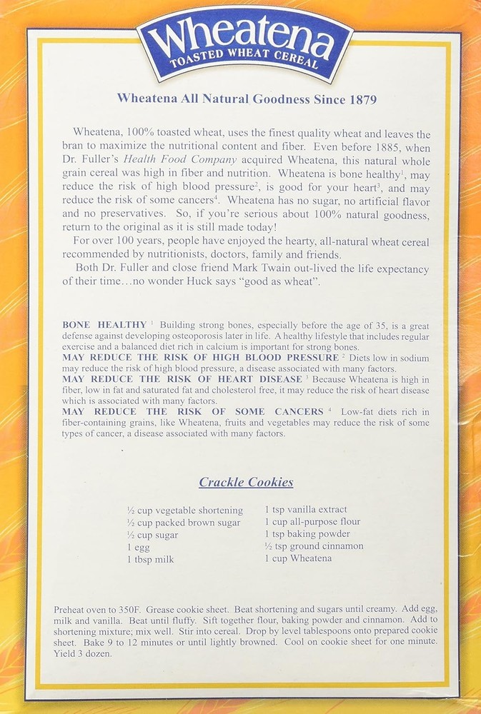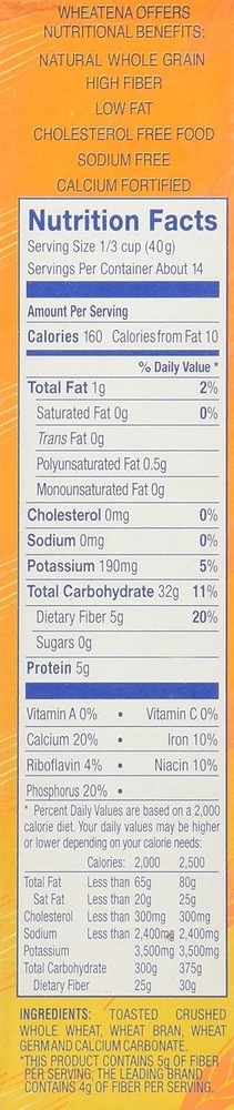 Wheatena Toasted Hot Wheat Cereal 20 oz Pack of 6 20 Ounce (Pack 6) Product Details Is Discontinued By Manufacturer : No Package Dimensions : 15.71 x 7.91 x 4.17 inches; 1.25 Pounds UPC : 05 Manufacturer : Homestat Farm Ltd Units : 120.0 Ounce Brand: Wheatena Flavor: Toasted Hot Age Range (Description): Adult Item Form: Flaked Specialty: Whole Grain Wheatena is 100% All Natural Toasted Whole Wheat With 25% More fiber than the leading brand of hot cereal Excellent Source of Calcium, Fiber, Iron And Protein As Well As Other Vitamins & Minerals Wheatena is a versatile grain that can be easily added to your favorite recipes such as muffins, quick breads, stuffing and other side dishes. It increases the fiber and nutritional value without adding cholesterol. Wheatena Toasted Wheat Cereal Includes 6-20 oz Boxes, total of 120 Ounces OU Parve NON GMO Salt Free Zero Trans Fat Wheatena Toasted Hot Wheat Cereal 20 oz Pack of 6