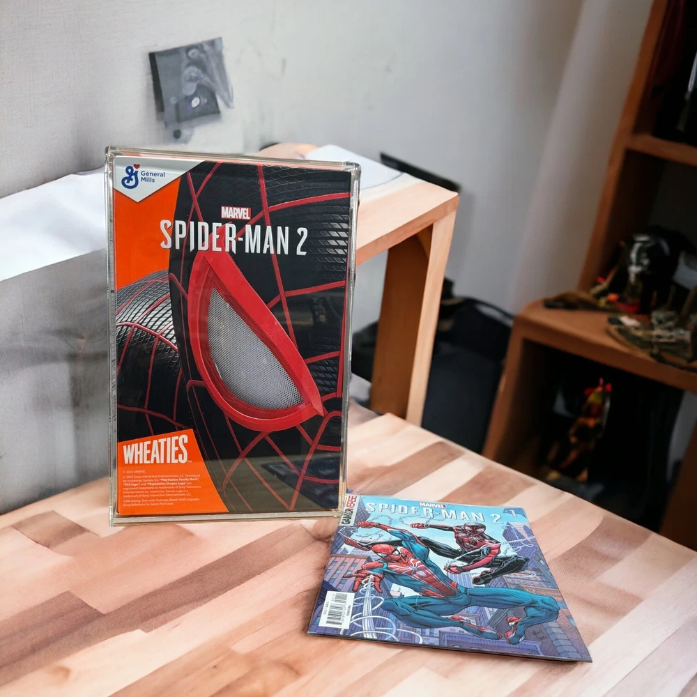 This limited edition Wheaties box features Spider-Man 2 for the Sony Playstation, complete with a comic book and PSN voucher code. The box is encased in acrylic and is one of only 500 made. The vibrant orange color and iconic Spider-Man graphics make this a must-have for any fan of the web-slinger. The box is an original piece of advertising for the cereal brand and was created in October 2023. Add it to your collection of collectibles from the advertising, food and beverage, and cereal categories. Brand new includes code