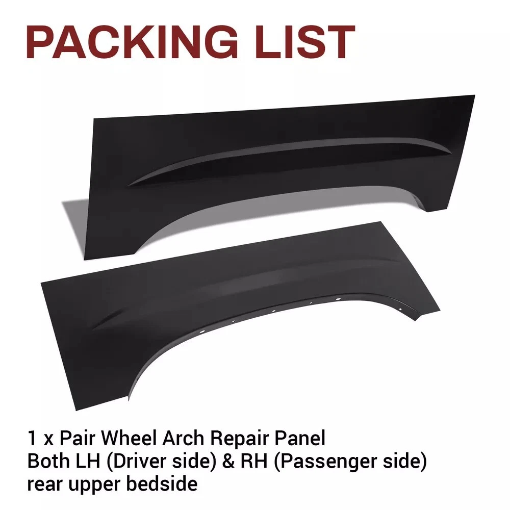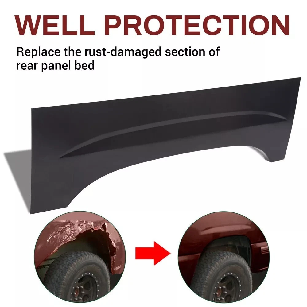 Wheel Arch Repair Panel Upper Rear Pair for 99-07 Chevy Silverado GMC Sierra Fit For 1999-06 Chevy Silverado 1500 Rear Upper For 2007 Chevy Silverado 1500 Classic Rear Upper For 2005-06 Chevy Silverado 1500 HD Rear Upper For 2001-03 Chevy Silverado 1500 HD Rear Upper For 2007 Chevy Silverado 1500 HD Classic Rear Upper For 1999-04 Chevy Silverado 2500 Rear Upper For 2001-06 Chevy Silverado 2500 HD Rear Upper For 2007 Chevy Silverado 2500 HD Classic Rear Upper For 2001-06 Chevy Silverado 3500 Rear Upper For 2007 Chevy Silverado 3500 Classic Rear Upper For 1999-06 GMC Sierra 1500 Rear Upper For 2007 GMC Sierra 1500 Classic Rear Upper For 2005-06 GMC Sierra 1500 HD Rear Upper For 2001-03 GMC Sierra 1500 HD Rear Upper For 2007 GMC Sierra 1500 HD Classic Rear Upper For 1999-04 GMC Sierra 2500 Rear Upper For 2001-06 GMC Sierra 2500 HD Rear Upper For 2007 GMC Sierra 2500 HD Classic Rear Upper For 2001-06 GMC Sierra 3500 Rear Upper For 2007 GMC Sierra 3500 Classic Rear Upper Feature 100% brand new Order by 3PM EST and today ships Always Free Shipping with your gogreenbike orders. Lowest price on brand new, in-the-box auto parts. PAIR Rear Upper Bedside Steel construction Die Stamped for exact fit Bumps or seams are in the exact same place as the original panel Specification Condition: Brand new Color: Black Material: Steel Width: 37" Height: 12-1/4" Packing list 1 x Pair Wheel Arch Repair Panel