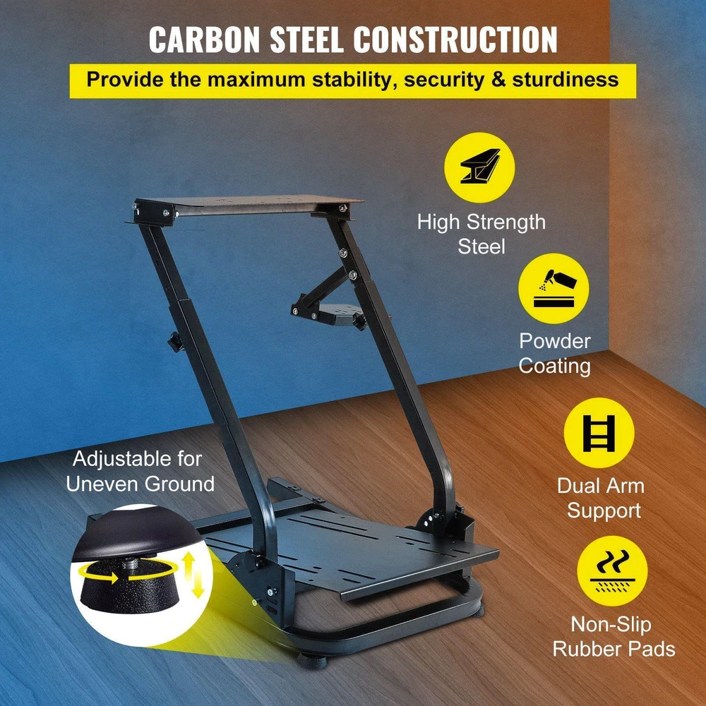Default:Default This universally designed sim cockpit is compatible with, Fanatec, Thrustmaster, CSR wheels, pedals, and shifters. The cockpit allows players of different heights to use, featuring a sturdy carbon steel structure and entirely adjustment. As a result, you can enjoy a more comfortable and flexible game experience. It also can be folded for space-saving storage. The wheel, shifter, and pedals are NOT included. High Compatibility Fully Adjustable Durable Wheel Stand Foldable & Compact Optional Holder Position is a leading brand that specializes in equipment and tools. Along with thousands of motivated employees, is dedicated to providing our customers with equipment & tools at incredibly low prices. Today, has occupied markets of more than 200 countries with 10 million plus global members. Why Choose ? Premium Quality Incredibly Low Prices Fast & Secure Delivery 30-Day Free Returns 24/7 Attentive Service Wide Compatibility This wheel stand is compatible with G25, G27, G29, G920, Thrustmaster, Fanatec, and CSR pedals on the market with pre-drilled holes. Other wheels also can be clamped on the holder. Flexible Height & Angle The steering wheel stand is adjustable in angle, tilt, and height (27"-31.5"/68.5-80 cm), allowing players of different sizes to use it. In addition, you can tune your wheel and pedal to any ergonomic position. Sturdy Carbon Steel Our wheel stand is made of solid carbon steel, with maximum durability to prevent falling off. Besides, its sturdy frame gives you a reliable game experience in-lasting use. Folding in Seconds This wheel stand folds up fast and reduces to a small size without disassembling the device. Its foldable and compact design is convenient for you to put under the sofa or in the corner. Optional Shifter Mounting The gear shifter holder on the gaming wheel stand can be flexibly mounted on either side. So whether you drive left or right, you can use our bracket to enjoy sim games. Non-Skid Rubber Pads There are four non-skid rubber pads at the simulator cockpit's bottom, holding the floor firmly and keeping the bracket stable. So you never need to worry about the damage to the floor. Specifications Model: G920ZDJ Material: Carbon Steel Adjustable Height: 27"-31.5"/68.5-80 cm Base Size (L x W): 18.9" x 22.6"/48 x 57.5 cm Wheel Holder Size (L x W): 16.5" x 5.9"/42 x 15 cm Shifter Holder Size (L x W): 6.3" x 4.7"/16 x 12 cm Folding Size (L x W x H): 18.9" x 30.3" x 7.5"/48 x 77 x 19 cm Product Weight: 24.9 lbs/ 11.3 kg Compatible Model Thrustmaster T300RS, TX F458, T500RS, T3PA /GT) pedals Fanatec Clubsport & CSR pedals Package Content 1 x Steering Wheel Stand 4 x Rubber Pads 4 x Hand Knob Tightening Screws 4 x Straps 1 x Open-Ended Spanner 2 x Allen Wrenches 1 x Screws Kit