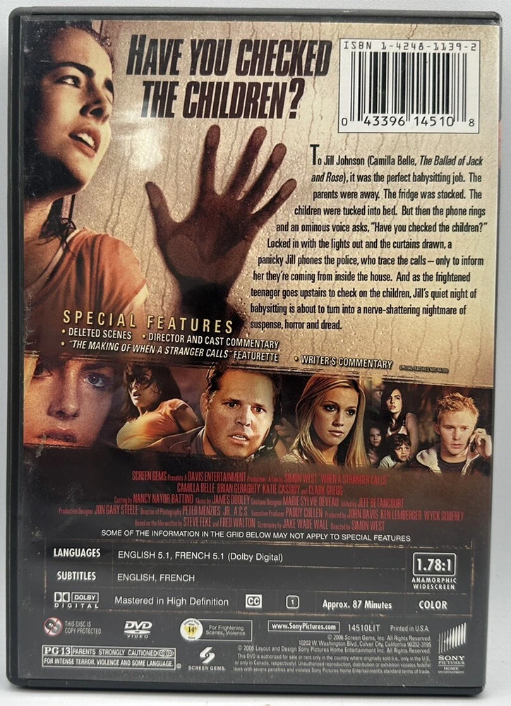 Experience the spine-tingling horror of "When a Stranger Calls" on DVD. Directed by Simon West and starring Camilla Belle and Clark Gregg, this suspenseful movie is perfect for fans of the slasher, family, and mystery sub-genres. This DVD edition comes with special features such as commentary, behind the scenes featurette, and widescreen format. It's rated PG-13 and has a run time of 87 minutes. Get your copy now and enjoy free shipping!