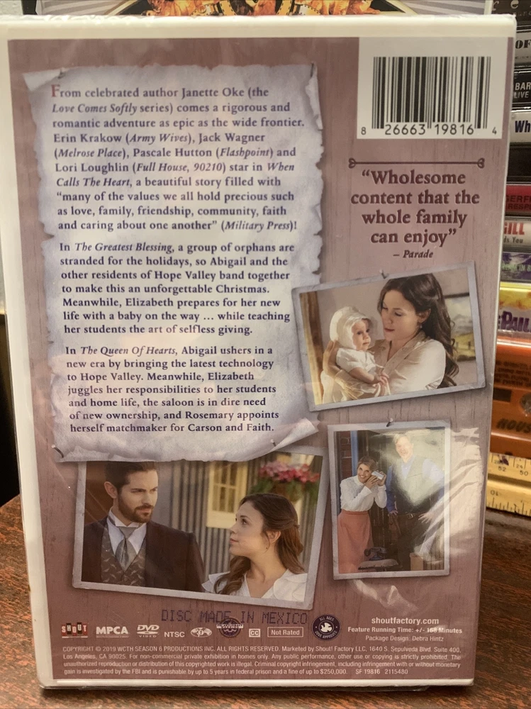 When Calls the Heart - 2 double fetures from seasons 6 & 7 - 4 movies in all - new, sealed - Hallmark channel. "Wholesome content that the whole family can enjoy" – Parade From celebrated author Janette Oke (the Love Comes Softly series) comes a rigorous and romantic adventure as epic as the wide frontier. Erin Krakow (Army Wives), Jack Wagner (Melrose Place) and Pascale Hutton (Flashpoint) star in When Calls the Heart, a beautiful story filled with "many of the values we all hold precious such as love, family, friendship, community, faith and caring about one another" (Military Press)! Finding Home & A Moving Picture In Finding Home, it's Christmastime once again in Hope Valley, and Lucas is host to a spectacular holiday festival for the town. Meanwhile, Elizabeth faces the challenge of finding a Christmas tradition that will create lasting memories for Little Jack. Then, in A Moving Picture, Elizabeth finds herself caught between two suitors, while Lee tries to make up for a failed anniversary vacation with Rosemary by bringing a bit of Hollywood to Hope Valley. The Greatest Blessing / The Queen Of Hearts After a group of orphans are stranded for the holidays, Abigail and the other residents of Hope Valley band together to make this an unforgettable Christmas. Meanwhile, Elizabeth prepares for her new life…while teaching her students the art of selfless giving.