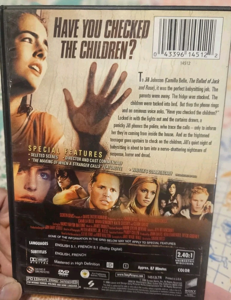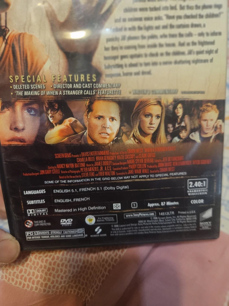 Format: DVD Case Type: Tall/DVD Case gtin13: 0043396145108 UPC: 0043396145108 Genre: Horror, Horror/Suspense Features: Deleted Scenes, Commentary, Widescreen, Behind The Scenes Featurette Actor: Camilla Belle Release Year: 2006 Movie/TV Title: When a Stranger Calls Studio: Sony Pictures Rating: PG-13 Type: Movie Language: English, French MPN: Does not apply Director: Simon West