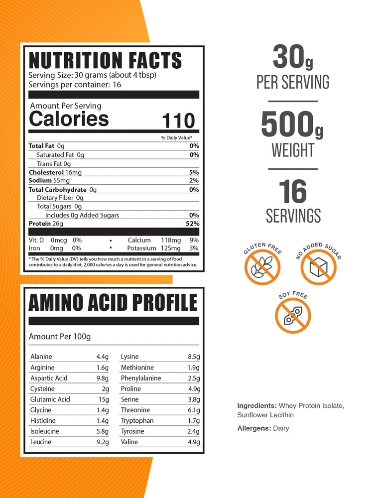 Maximize your Potential: Enhance your active lifestyle with our Whey Protein Isolate , an tasteless protein , designed to support your strength and performance goals. Each serving delivers a substantial 30 grams dose, catering to both fitness enthusiasts looking to push their limits. Versatile Protein Source: Whether you're an athlete, a sprinter, or someone simply looking to stay active, our Whey Isolate Protein , an unflavored protein , fits seamlessly into your regimen, adaptable to a wide range of dietary needs and preferences, especially not for people with dairy sensitivities. Optimized in every Serving: Our Whey Protein Isolate , of our Whey Protein , is unflavored and contains dairy, but also offering you a high-quality product that easily integrates with other supplements or your preferred shake or beverage. Transparent and Trustworthy: Experience the confidence that comes with choosing a that not only meets rigorous third-party testing but also upholds the principles of clarity and integrity in its formulation and production. Commitment to Excellence: Produced in a facility compliant with strict cGMP standards, our Whey Protein Isolate, of our protein unflavored, stands as a testament to our dedication to quality. You can trust in our product's consistency and excellence, batch after batch.