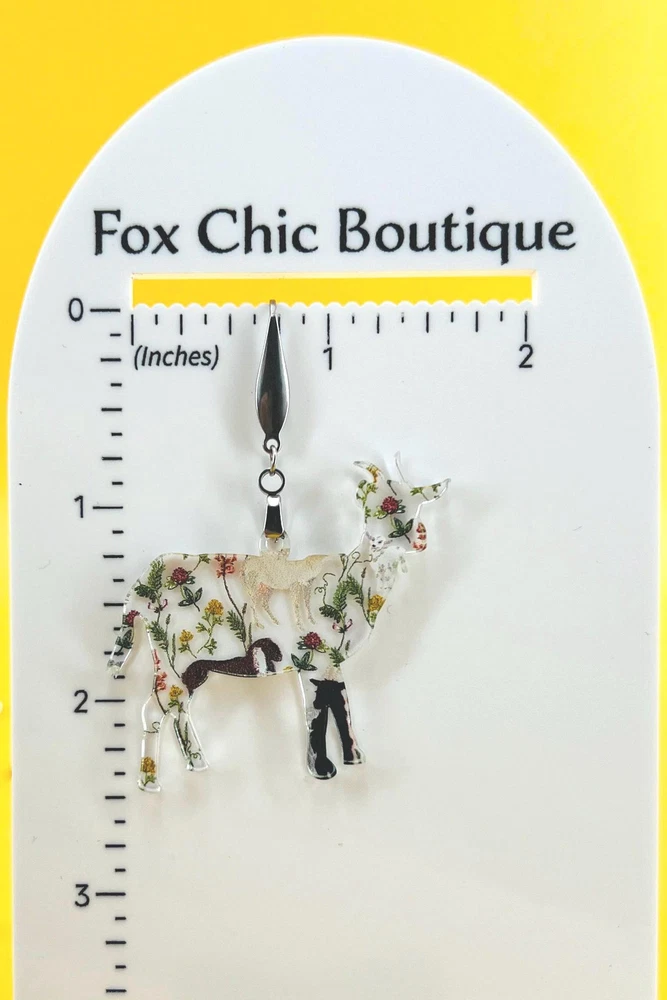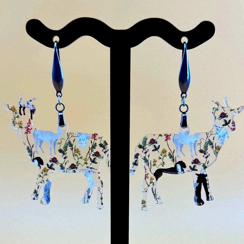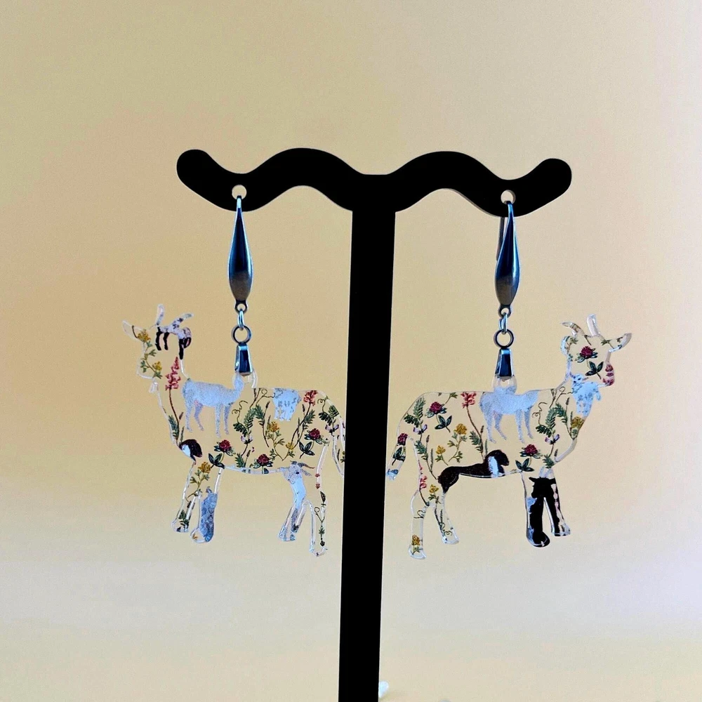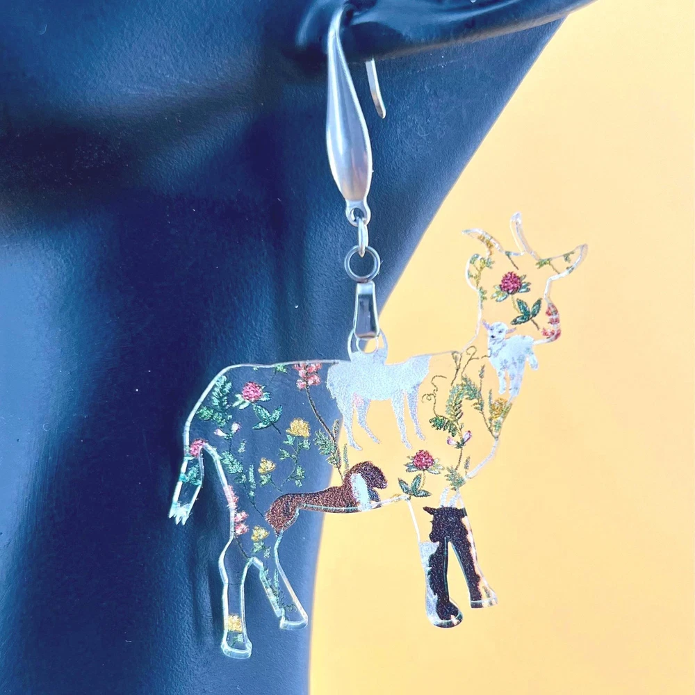 Embrace your love for farm animals with these whimsical goat dangle earrings! Fun and unique, these playful kid earrings are perfect for the goat lover in your life. Whether it's a gift for a farm animal enthusiast or a treat for yourself, these earrings are sure to bring a touch of charm to any outfit. Add a dose of fun to your jewelry collection with these delightful farm earrings. Lightweight Acrylic Earrings on a Stainless Steel hook. Earring hardware is stainless steel and nickel/lead free. 🌟(Please see item details/highlights/pictures for size information)🌟 Each earring is laser cut from acrylic and assembled by hand in our studio. 🌟Due to variation in the patterns and handmade processes, each earring will vary earring to earring. No two earrings will be identical but will look similar to what is pictured! Each pair of earrings comes on an earring card with silicone backers and packaged in an organza bag. Perfect for gift giving! We currently do not offer more gift-wrapping options. Shipping: All purchases are shipped in a box with tracking so that they arrive safely to you! Currently we only ship to US postal addresses. We have a set standard shipping time of 1-3 business days from the time your order is placed. Everything in our shop is already handmade and ready to ship FAST! Please be aware that unexpected delays can occur, which you will be notified at the time of any such occurrence. Jewelry Care: 🌟Each piece is delicate! Avoid dropping or bending! 🌟Do Not expose to excessive moisture, please remove jewelry before showering, swimming, and sleeping. 🌟Avoid abrasives, perfumes, lotions, excessive heat, chemicals etc. These may deteriorate your jewelry and may damage its appearance. 🌟Clean with the soft cloth we have included in your package (and it is FREE of Charge!) No Returns: Due to hygienic and safety reasons, ALL SALES ARE FINAL. We DO NOT accept returns. In the event you have an issue with your purchase, please feel free to message us on Etsy to discuss any possible resolution.