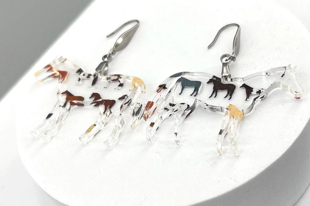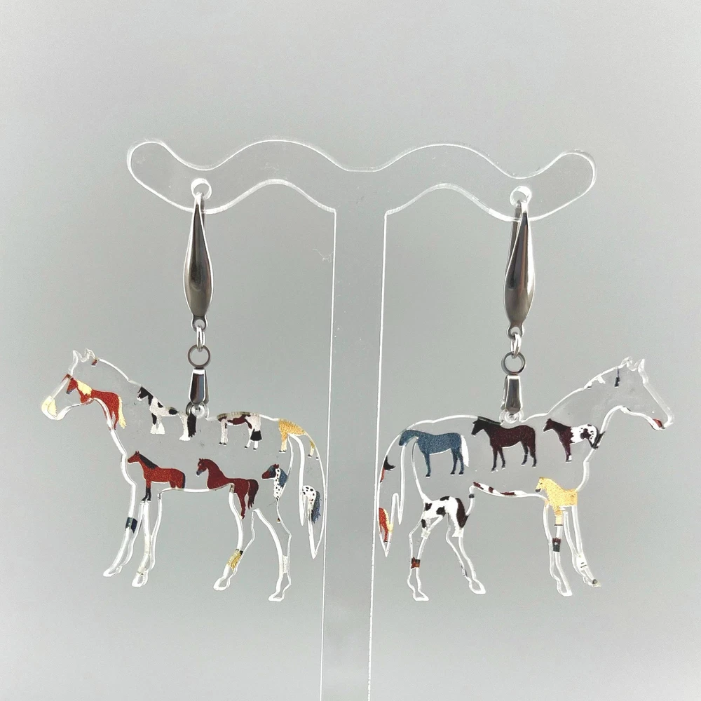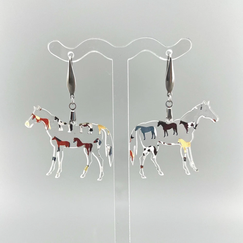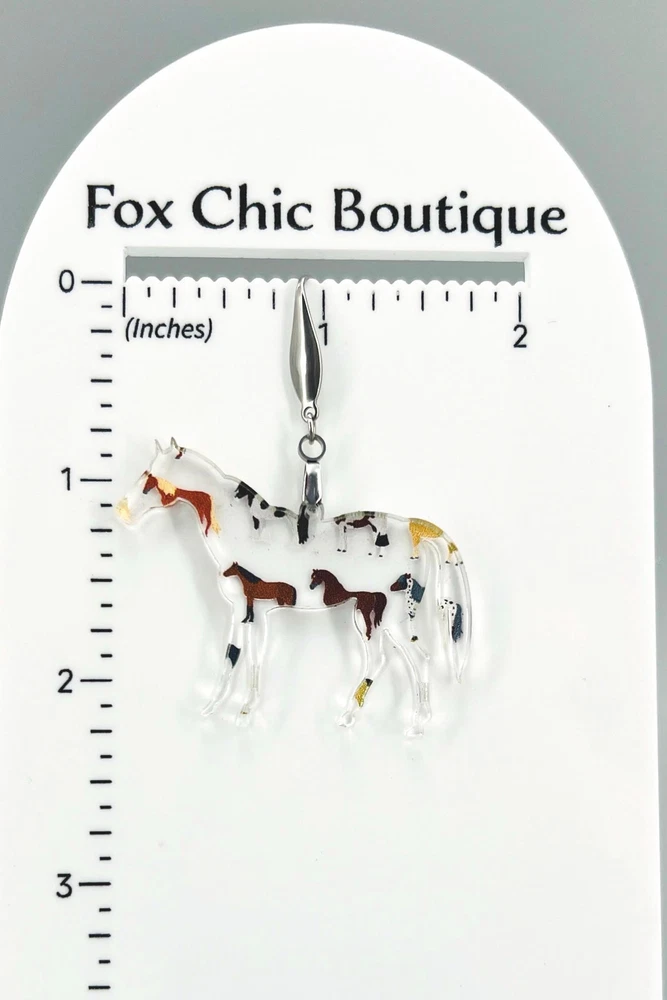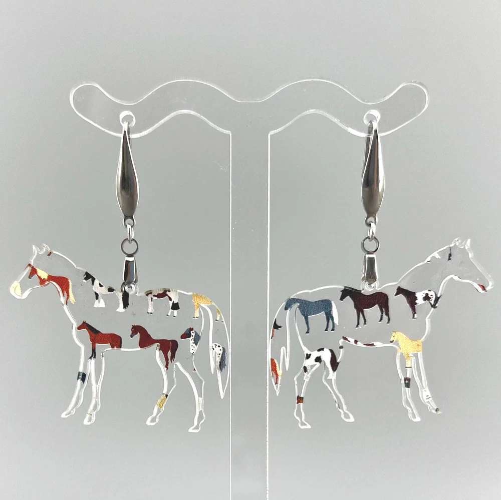 Add a touch of whimsy to your outfit with these charming horse earrings! Perfect for animal lovers, equestrians, and country girls alike. These unique earrings make a great gift for any horse lover in your life. Whether you're heading to the rodeo or just want to show off your love for horses, these earrings are sure to make a statement. Lightweight Acrylic Earrings on a Stainless Steel hook. Earring hardware is stainless steel and nickel/lead free. 🌟(Please see item details/highlights/pictures for size information)🌟 Each earring is laser cut from acrylic and assembled by hand in our studio. 🌟Due to variation in the patterns and handmade processes, each earring will vary earring to earring. No two earrings will be identical but will look similar to what is pictured! Each pair of earrings comes on an earring card with silicone backers and packaged in an organza bag. Perfect for gift giving! We currently do not offer more gift-wrapping options. Shipping: All purchases are shipped in a box with tracking so that they arrive safely to you! Currently we only ship to US postal addresses. We have a set standard shipping time of 1-3 business days from the time your order is placed. Everything in our shop is already handmade and ready to ship FAST! Please be aware that unexpected delays can occur, which you will be notified at the time of any such occurrence. Jewelry Care: 🌟Each piece is delicate! Avoid dropping or bending! 🌟Do Not expose to excessive moisture, please remove jewelry before showering, swimming, and sleeping. 🌟Avoid abrasives, perfumes, lotions, excessive heat, chemicals etc. These may deteriorate your jewelry and may damage its appearance. 🌟Clean with the soft cloth we have included in your package (and it is FREE of Charge!) No Returns: Due to hygienic and safety reasons, ALL SALES ARE FINAL. We DO NOT accept returns. In the event you have an issue with your purchase, please feel free to message us on Etsy to discuss any possible resolution.