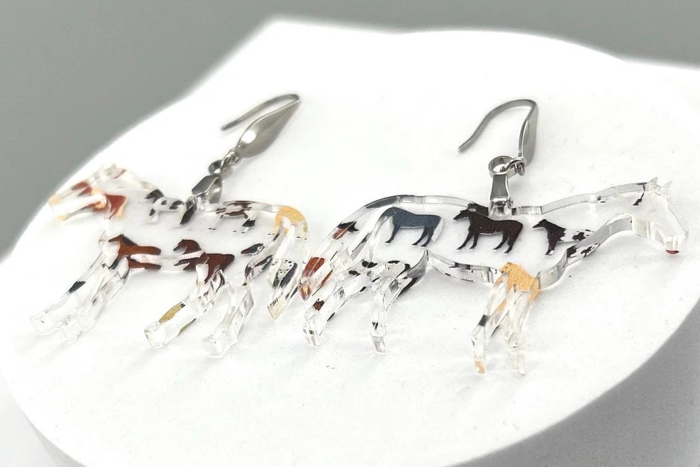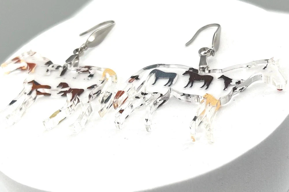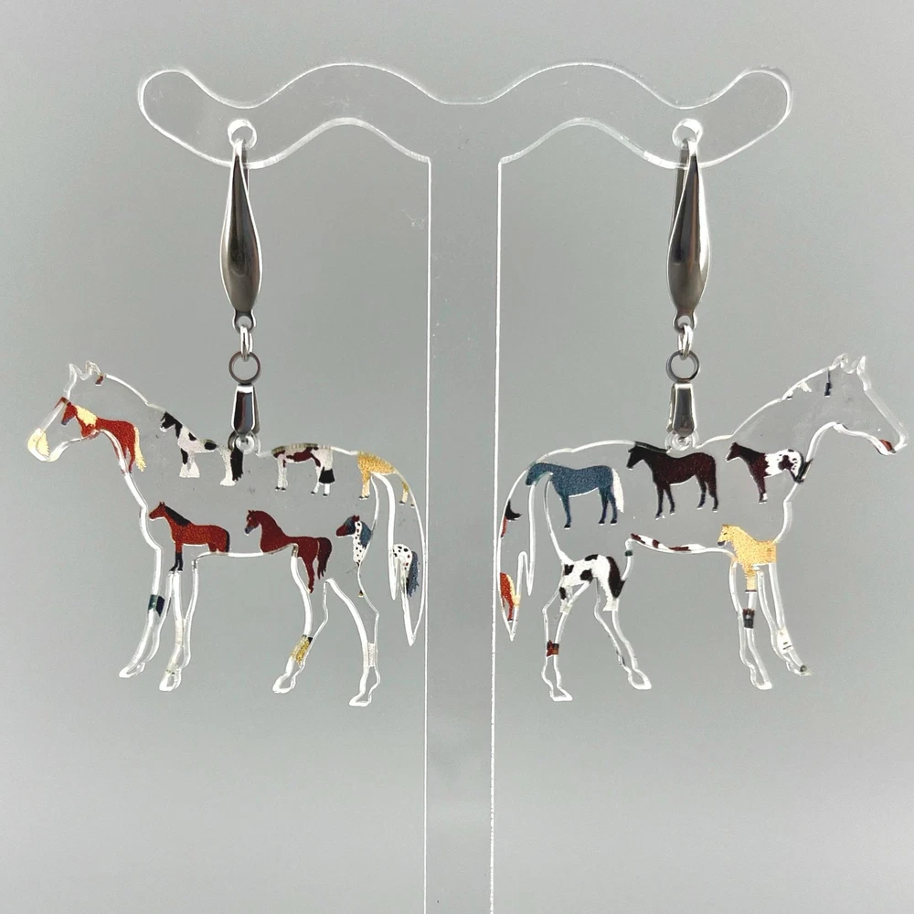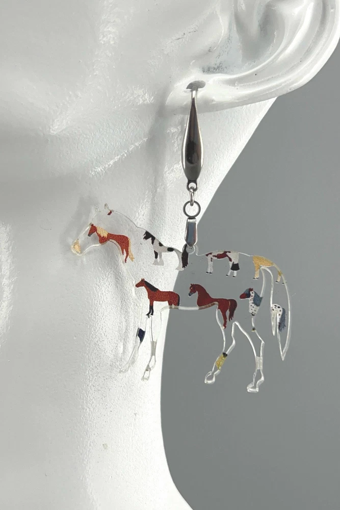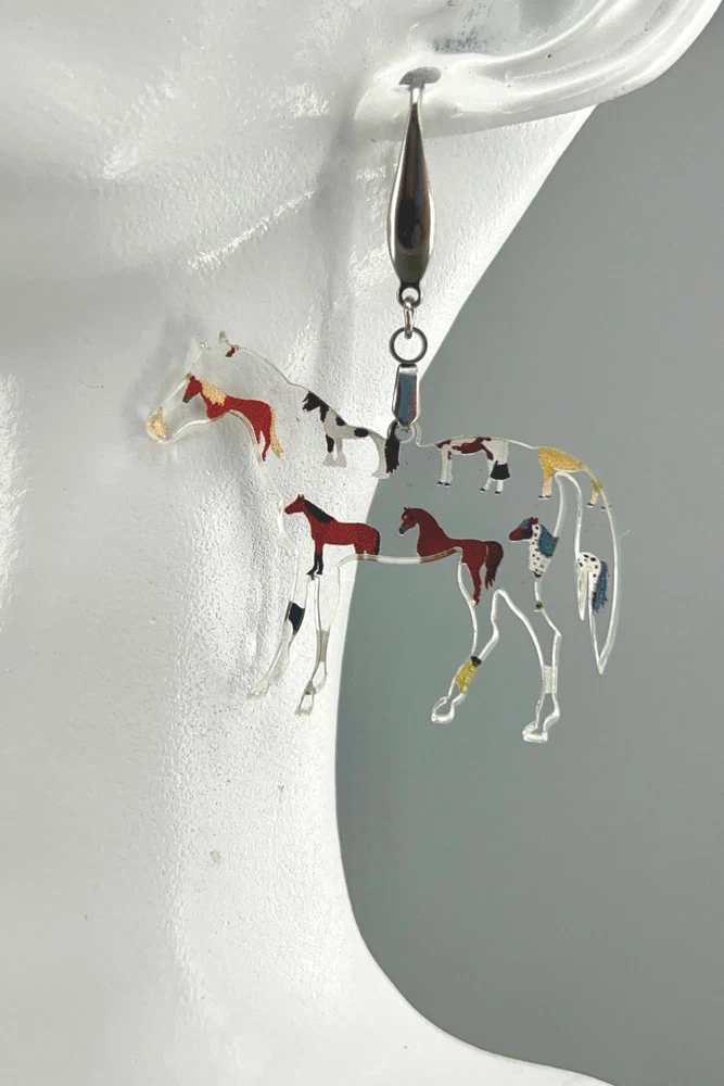 Add a touch of whimsy to your outfit with these charming horse earrings! Perfect for animal lovers, equestrians, and country girls alike. These unique earrings make a great gift for any horse lover in your life. Whether you're heading to the rodeo or just want to show off your love for horses, these earrings are sure to make a statement. Lightweight Acrylic Earrings on a Stainless Steel hook. Earring hardware is stainless steel and nickel/lead free. 🌟(Please see item details/highlights/pictures for size information)🌟 Each earring is laser cut from acrylic and assembled by hand in our studio. 🌟Due to variation in the patterns and handmade processes, each earring will vary earring to earring. No two earrings will be identical but will look similar to what is pictured! Each pair of earrings comes on an earring card with silicone backers and packaged in an organza bag. Perfect for gift giving! We currently do not offer more gift-wrapping options. Shipping: All purchases are shipped in a box with tracking so that they arrive safely to you! Currently we only ship to US postal addresses. We have a set standard shipping time of 1-3 business days from the time your order is placed. Everything in our shop is already handmade and ready to ship FAST! Please be aware that unexpected delays can occur, which you will be notified at the time of any such occurrence. Jewelry Care: 🌟Each piece is delicate! Avoid dropping or bending! 🌟Do Not expose to excessive moisture, please remove jewelry before showering, swimming, and sleeping. 🌟Avoid abrasives, perfumes, lotions, excessive heat, chemicals etc. These may deteriorate your jewelry and may damage its appearance. 🌟Clean with the soft cloth we have included in your package (and it is FREE of Charge!) No Returns: Due to hygienic and safety reasons, ALL SALES ARE FINAL. We DO NOT accept returns. In the event you have an issue with your purchase, please feel free to message us on Etsy to discuss any possible resolution.