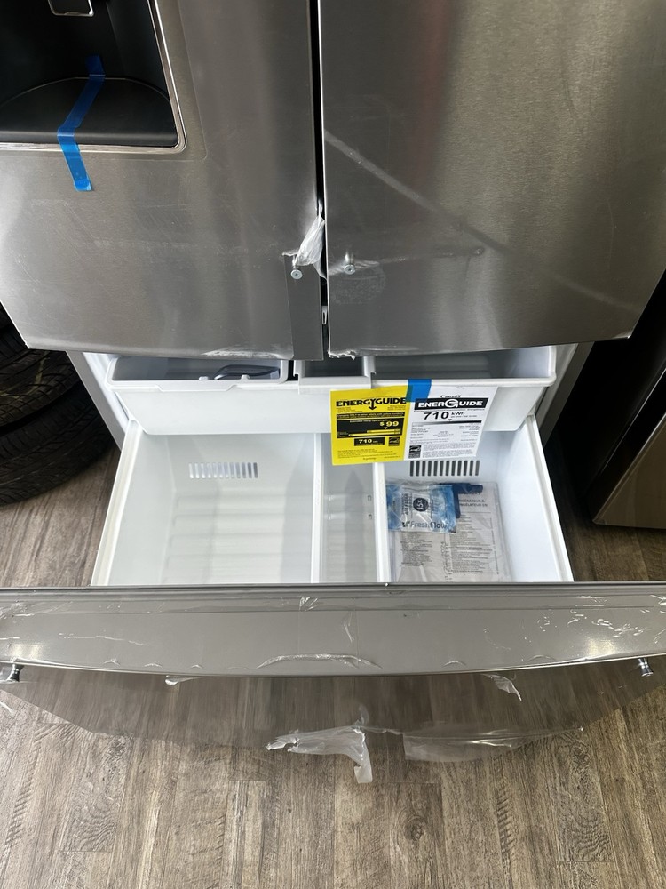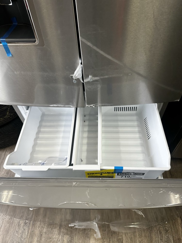 This Whirlpool French Door Refrigerator is a new freestanding unit with a capacity of 25.1-30 ft³. It features a frost-free/automatic defrost method and an adjustable thermostat. The refrigerator has a silver stainless steel finish and LED lighting. With three shelves and seven drawers, this refrigerator provides ample storage space. It also includes a water dispenser, in-door ice storage, a digital control panel, and a door open alarm. The refrigerator has a soft close door and spill-proof shelves. Additionally, it features dual ice makers located below the refrigerator. This model, Whirlpool WRF767SDHZ05, is Energy Star certified with a rating of 5 stars and comes with a 1-year manufacturer warranty.