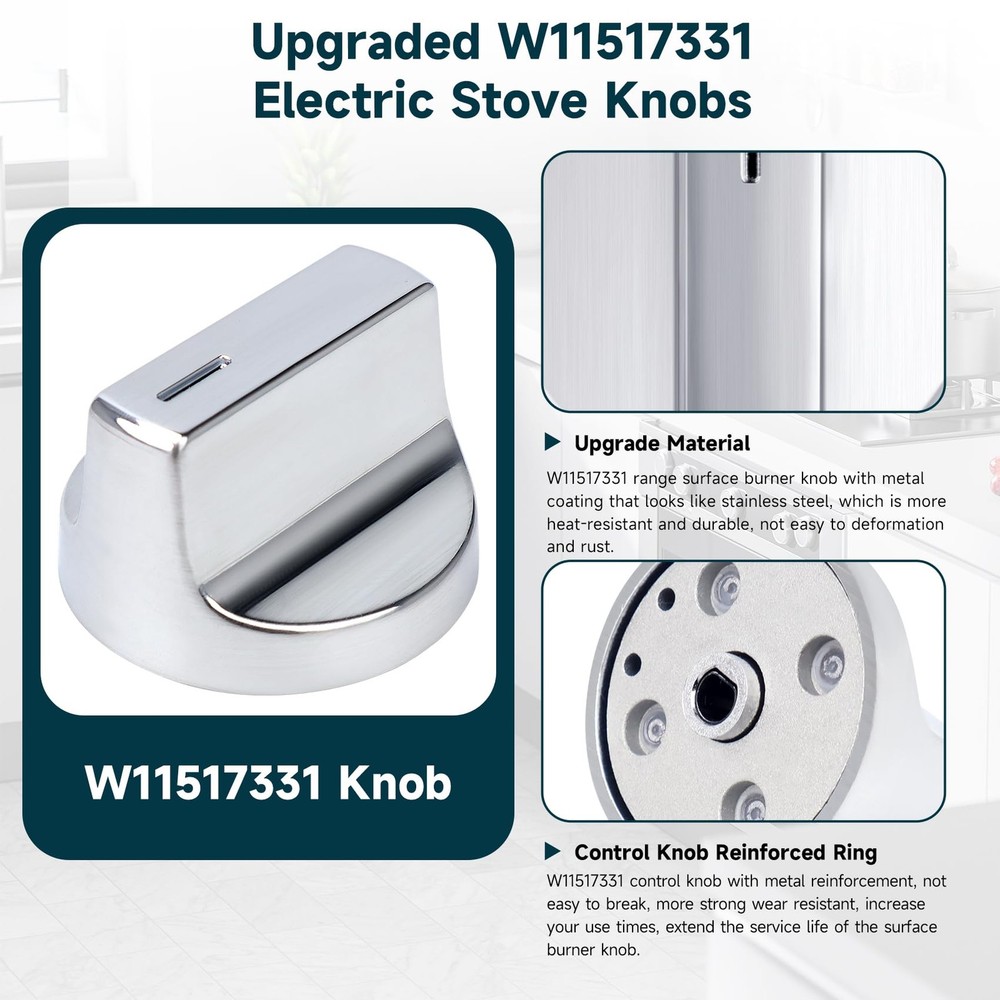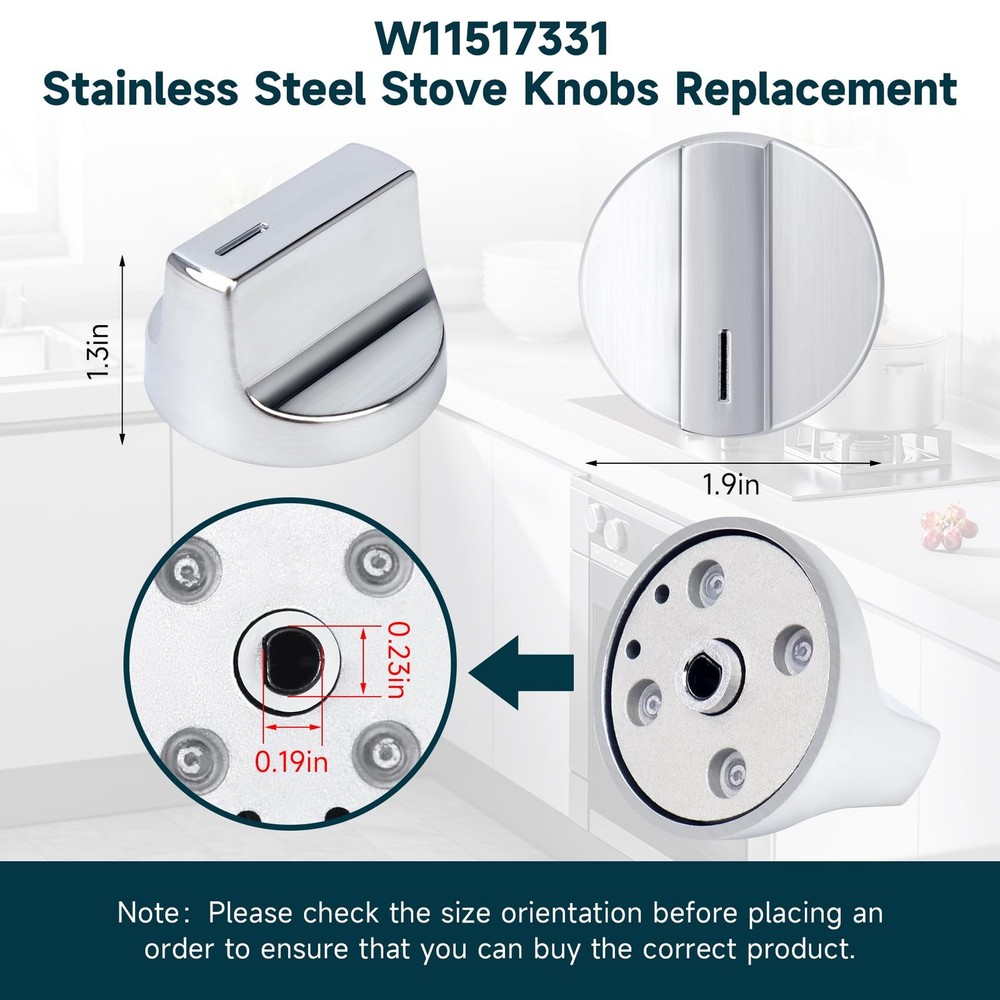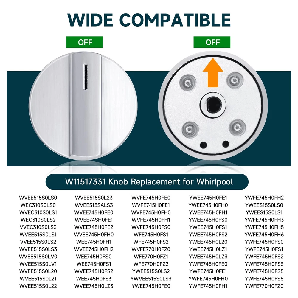 W11517331,W11517331 knob, W11517331 for whirlpool Electric Range Knobs, W11517331 Electric Range Knobs, W11517331 Knobs, W11517331 Range Knobs, W11517331 stove knob, W11517331 Oven Knobs, W10850027 W11117415, W11458840 【W11517331 Perfect Compatibility】W11517331 stove knobs Compatible with whirlpool WEC310S0LS1, WEE515S0LZ1, WEC310S0LS2, WEE515S0LS1, WEC310S0LS3, WEE515S0LZ2, WEE515S0LS2, WEE515S0LV0, WEE515SALS0, WEE515SALS1, WEE515S0LS0, WEC310S0LS0, YWED745H0FE0, YWED74580FH0, YWHE975H0FS0 etc, If you are not sure if it is suitable for your machine, please contact us and I will solve it for you. 【W11517331 Replace part numbers】 W11517331 Electric Range Knobs Replace W10850027, W11117415, W11458840 knbs, AP7002931, PS16543518, EAP16543518, Please double check your machine model number before purchase to ensure compatibility. 【High quality material: W11517331 for whirlpool Electric Range Knobs back side is made of metal stainless steel, reinforcing the whole, not easy to deform,With a thick solid ring. More heat-resistant, abrasion-resistant, Long service life. Smooth surface, easy to wipe clean after oil, making daily maintenance and cleaning simple. 【Easy to install】Our W11517331 Knobs works perfectly with the machine. You can simply remove the old knobs and install the new knob without using any tools in just a few seconds. Can save you valuable time. 【Risk-free shopping】We are committed to customer satisfaction. If you are not satisfied with the product, please contact us. We will fix the problem within 24 hours.
