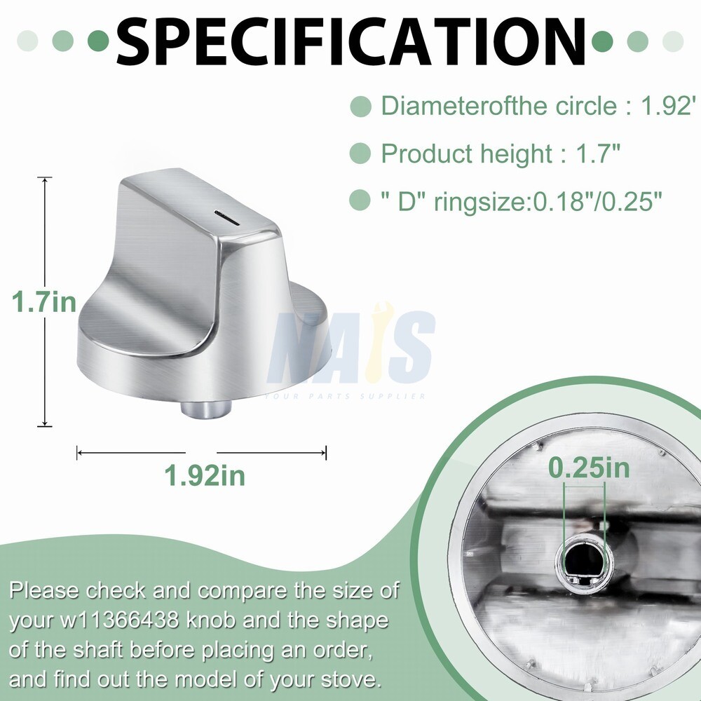 Durable: The metal sleeve on the back of the W11366438 Whirlpool oven knobs, which fits over the burner control rod on the range, is durable and designed to resist movement during use and can withstand heat and regular use. Easy to install: 1. Take off the Existing Knobs: Ensure that the knobs on the Whirlpool gas range are turned off securely, then grab the replacement knobs for the Whirlpool range and pull them away from the stove. 2. Put on the New Knobs: Line up the replacement knobs for the Whirlpool stove with the stem or shaft of the replacement parts and ensure that the Whirlpool cooktop knobs are in the “off” position. 3. Check the Functionality: Turn the Whirlpool knob slightly to confirm that the replacement accessories are functioning correctly. Compatible with Whirlpool Range Parts Number: Whirlpool W11366438, W11084623, KIP 5T08, KIP5T08, W11084624, W11204451, W11222053, W11130629, KIP 5J93 and more, wcg77us0hs knobs, wcg55us6hs00 knobs, wcg55us0hs00 knobs, wcg97us0hs00 knobs, wcg97us6hs00 gas knob, whirlpool range knob 5j93 part w11222053 w10850010, wcg77us0hs00 knob, wcg55usohs00 knob whirlpool, wcg97us6hsoo stove control knobs. Compatible with Whirlpool Gas Stove Parts: Whirlpool WCG55US6HS00, WCG55US6HS, WCG77US0HS, WCG97US0HS05, WCG55US0HS00, WCG97US6HS00, WCG97US0HS00, WCG97US6HS, WCG55US6HS05, WCG77US0HS00, WCG77USOHS00, WCG77USOHS00, WCG55USOHS00, WCG97US6HSOO, WCG55US0HS05, WCG55US0HS and more, wcg55us6hs knobs. Precautions: Make sure to turn off and allow the gas stove parts to cool down before beginning the removal process to avoid any accidental burns or injuries. If you are unsure about the compatibility of the W11366438 electric stove knobs assembly with your Whirlpool range knobs, we are happy to help you. On Jun 9, 2025 at 10:07:07 PDT, seller added the following information:
