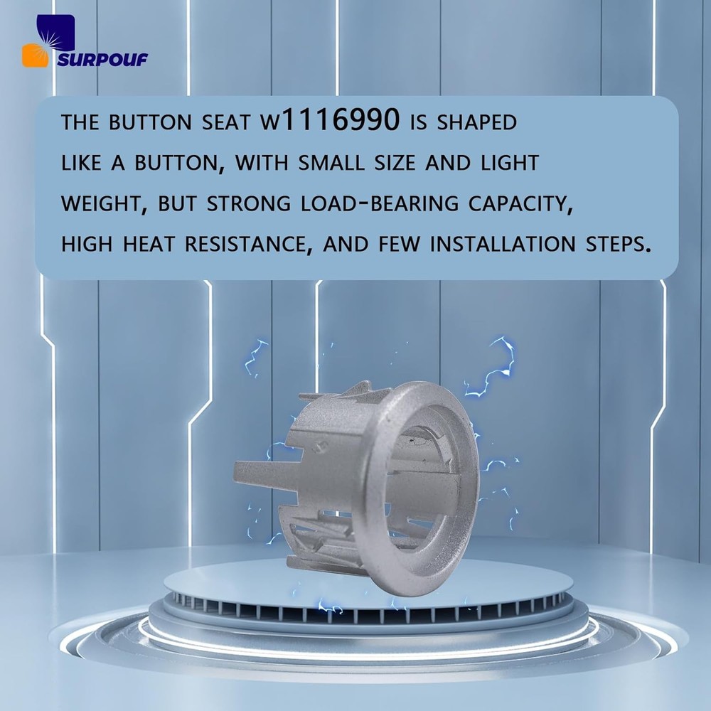 W11116990 Button Holder Fits for Whirlpool W10251250 KitchenAid Maytag as pic Product Details Manufacturer: SURPOUF Part Number: W11116990 Item Weight: 0.352 ounces Product Dimensions: 0.63 x 0.63 x 0.59 inches Item model number: W11116990 Color: as pic Included Components: 1pc Button Holder Batteries Included?: No Batteries Required?: No W11116990 microwave holder fits for Whirlpool Maytag KitchenAid Jenn-Air Amana Magic Chef Admiral Norge Roper Kenmore and others. Fits for:IBMS1456XB0-WPL,IBMS1456XS0-WP,IBMS1455DS01-WPL,IBMS1455VS0-WPL,IBMS1455VW0-WPL ,IBMS1455DS00-WPL,IBMS1455WW0-WPL,IBMS1455WS0-WPL,IBMS1455XB0-WPL. Feature:microwave holder shaped like a button, it is small and lightweight, but its load-bearing capacity is strong, heat resistance is high, and installation steps are few. People can use it well, making it an essential kitchen helper. Package include:1pc w11116990 microwave holder. The W11116990 button holder mainly plays a role in connecting the buttons of the microwave oven, so it must have the characteristics of high temperature resistance and corrosion resistance generated during the operation of the microwave oven.