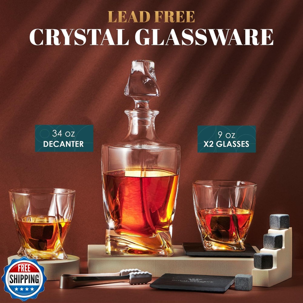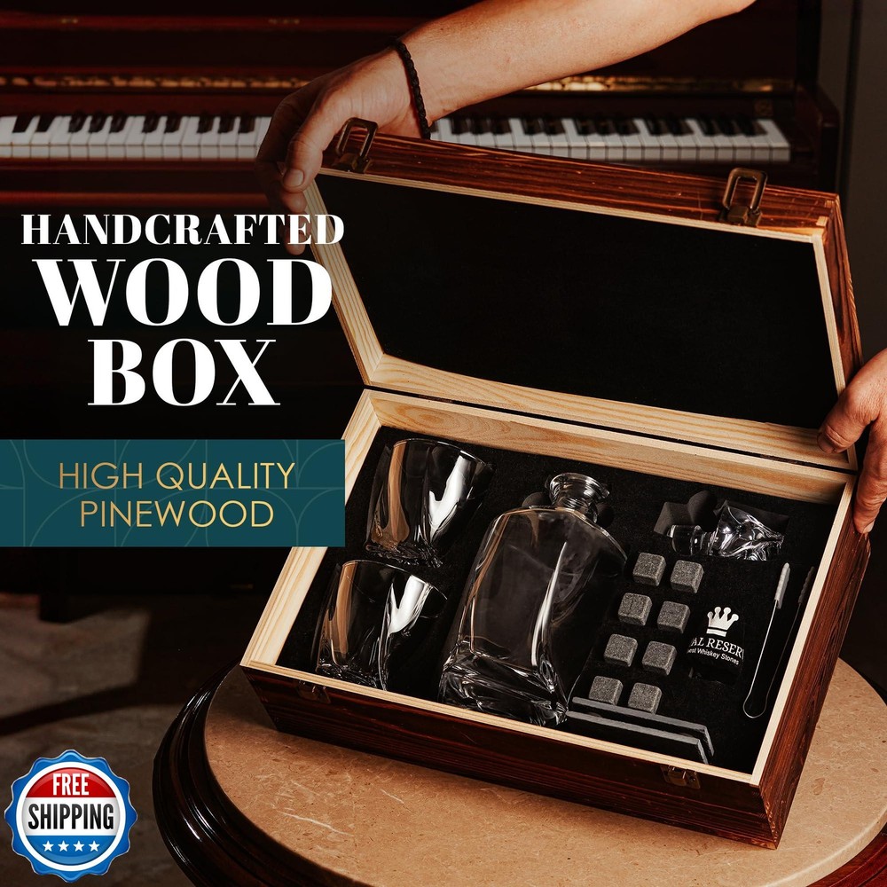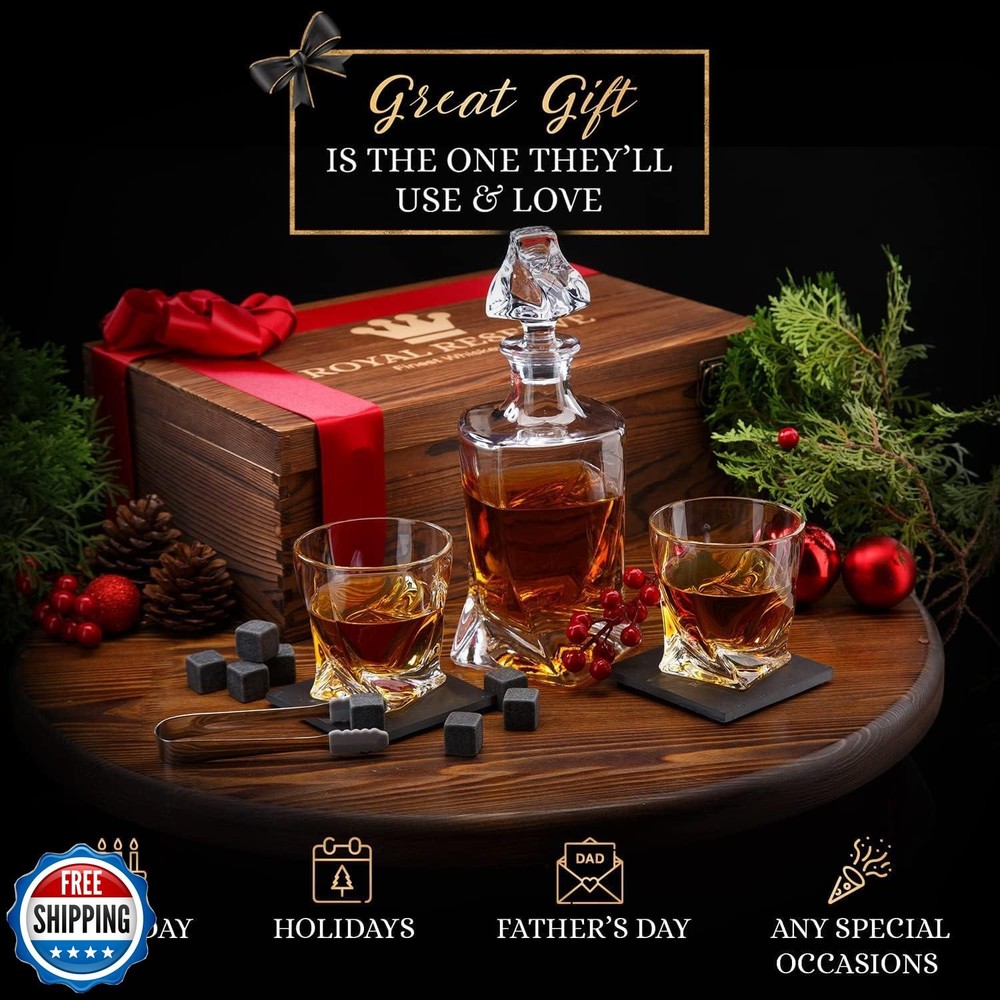 Whiskey Decanter Set by Royal Reserve – Whiskey Gift Set - Twisted Bourbon Decanter 34 oz 1000 ml with Glasses, Whiskey Stones, Coasters, Tongs – Whiskey Gifts for Men, Husband, Dad Christmas Features Exquisite Gift Set: This bourbon decanter set includes whiskey glasses, stones, coasters, and tongs, all beautifully packaged in a handcrafted wooden box. Perfect for gifting on Christmas, birthdays, weddings, or any special occasion. Premium Quality & Craftsmanship: Experience the elegance of thick, high-quality glass and expert craftsmanship in this decanter sets for men. Designed for a high-end look and lasting durability, it's the perfect blend of luxury and value. Bar Upgrade: Add a touch of refinement to your bar or man cave with this whiskey set. The crystal twisted scotch decanter and solid tumblers combine style and function, offering a practical way to serve perfectly chilled drinks. Ice Alternative: Crafted from 100% natural granite, our whiskey stones cool your drinks without diluting them. Non-porous and polished to prevent scratching, they preserve the original taste and texture of your whiskey. Satisfaction Guaranteed: Made with care by skilled artisans, the Royal Reserve whisky decanter sets is backed by a 1-year defect guarantee, ensuring long-lasting enjoyment of your favorite drinks, risk-free. Shipping Free & Fast Shipping: We offer free shipping to most of the USA with a normal delivery time of 3-7 days. However, due to the current situation, additional delivery time (up to 3 weeks) may be required for some items. Alternative Carriers: We may use alternative carriers (e.g., USPS, FedEx, UPS) to ensure your package arrives safely and on time. Due to the use of multiple carriers, we are unable to provide a tracking number automatically. Handling Time: Orders are processed and shipped within 1-2 business days of receiving cleared payment. Shipping Restrictions: Shipping to Alaska, Hawaii, Puerto Rico, Guam, and other US territories may incur shipping charges or delivery restrictions. Please contact us before ordering, or your order can be refunded/cancelled. State Restrictions: Certain items may not be shipped to California due to state regulations. Contact for Tracking Updates: If you require tracking updates or have any concerns about the delivery of your order, please feel free to contact us, and we will be happy to assist you. Return Policy 30-Day Hassle-Free Returns: If you are not completely satisfied with your purchase, you can return the item for free within 30 days of receiving it for a full refund or exchange. Easy Return Process: Contact us, and we will provide you with a prepaid return shipping label and detailed instructions. No Restocking Fee: There are no restocking fees for returns. However, the buyer is responsible for return shipping costs if the return is not due to a seller"s error. Refund Processing: Refunds will be processed within 1 business day of receiving the returned item in its original condition. Feedback Your feedback is extremely important to us. We strive to provide the best products and customer service possible. If you are satisfied with your purchase, please take a moment to leave us a positive review. If you have any concerns or issues with your order, please contact us before leaving negative feedback. We are committed to resolving any problems and ensuring your satisfaction. Contact Us If you have any questions or concerns, please feel free to reach out to our customer support team. You can contact us through the eBay messaging system. We are available Monday to Friday, 9:00 am to 5:00 pm EST, and we will do our best to respond to your inquiry within 24 hours. Thank you for supporting our small family business!