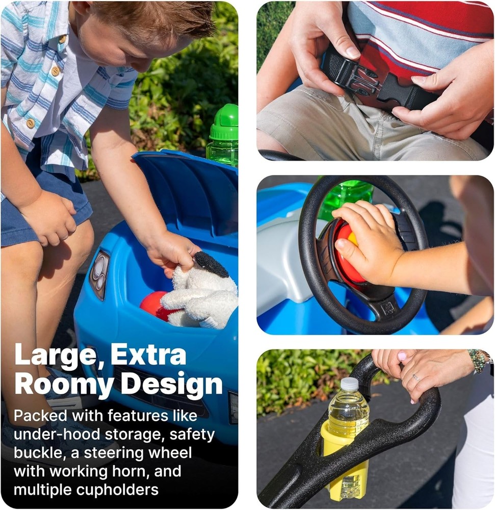 From the manufacturer Whisper Ride II Features Safety Belt This kid's ride-on toy car features a child seat belt for added riding safety. Honking Horn Movable kid's steering wheel features a honking horn and allows little ones to pretend they are driving their own car. Kid's Cup Holders Push car dashboard features dual cup holders that accommodate a snack and drink for your little one. Easy-Fold Handle Kid's ride-on features an easy-fold parent push handle for easy transport and setup. Whisper Ride II - Blue Whisper Ride II - Pink Easy Steer Sportster Push Around Buggy Add to Cart Add to Cart Buying Options Buying Options Customer Reviews 4.6 out of 5 stars 15,846 4.6 out of 5 stars 15,846 — — Price $79.00 $ 79 . 00 $79.00 $ 79 . 00 — no data — no data Whisper Wheels ✓ ✓ ✓ X Folding Handle ✓ ✓ ✓ X Storage ✓ ✓ ✓ ✓ Cup holders 3 3 3 0 Product Description Our amazing Ride-On Car is the ideal push toy for toddlers aged 2-4 years old! This versatile car can support a maximum weight of 50 pounds. It has an extra-wide rear parent grasp handle for added comfort when guiding their children. This car's "whisper ride" wheels provide a smooth and quiet ride, allowing your child to easily cruise around the neighborhood. Because safety is our main priority, our Ride-On Car has an easy-latch adjustable seat belt. It has a genuine car horn and steering wheel, which adds to the immersive play experience. The car also has two cup holders, which are useful for both the rider and the parents. The under-hood storage box is ideal for storing snacks and toys, making this car more engaging than a standard toddler wagon or stroller. It's never been easier to clean up after playtime. Simply wipe away messes with a disinfectant wipe or home cleanser. The Ride-On Car, like all our items, is built to last, with a sturdy double-walled plastic design that ensures years of use. The brilliant colors are resistant to chipping, fading, cracking, and peeling, guaranteeing that the automobile looks good even after a lot of play. From the Manufacturer The Step2 Whisper Ride II Buggy – Blue is an updated, roomier version of one of Step2's best sellers. This cute little machine features a sleek automotive design with soft poly wheels to help provide a smooth, quiet ride. It also features storage under the hood, as well as a handle that can be folded underneath the body to help simplify transport and storage.