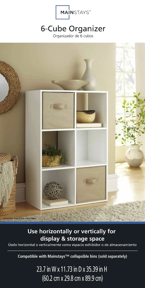 Product details The 6-Cube Storage Organizer features six compartments perfectly sized for storing and displaying office supplies, books, clothes, craft supplies, photos, collectibles and so much more! This sturdy bookcase can stand vertically or horizontally to best suit your needs and space. They are compatible with 10.5" x 10.5" collapsible storage bins (sold separately) and available in multiple finishes. Three open-back cube shelves make managing cords and cables easy, while three closed-back shelves help keep items securely housed. Add an accent piece that is both functional and stylish to your living room, family room, home office, playroom, closet and more, with the 6-Cube Storage Organizer. Stylish 6-cube organizer bookcase Features six 11" x 11" x 11" open storage compartments Can be used vertically or horizontally to fit your space and needs Designed with 3 open-back shelves and 3 closed-back cube shelves Top panel and 2 middle shelves support up to 22 lbs each; bottom panel supports up to 33 lbs Compatible with 10.5" x 10.5" collapsible storage bins (sold separately) Perfect for use in dens, living rooms, family rooms, playrooms, home offices and more Materials: particle board, paperboard Finishes available: White (MS5336278612010), Black (MS5336278612009), Canyon Walnut (MS18-D1-1009-49) and Rustic Brown (MS18-D1-1009-48) Attaches to the wall with included hardware for safety Easy to assemble with included instructions and assembly video guide (hammer & Phillips head screwdriver required) Package size: 39.53" x 4.17" x 15.28" (32.81 lbs) Assembled weight: 32.5 lbs Assembled dimensions: 23.7" W x 11.73" D x 35.39" H