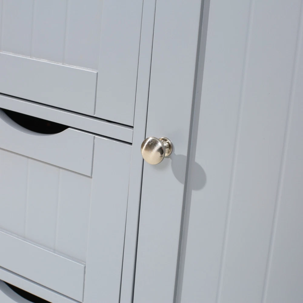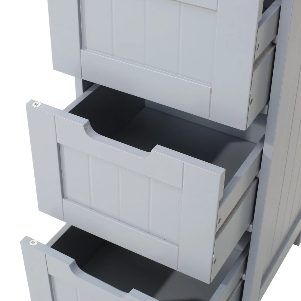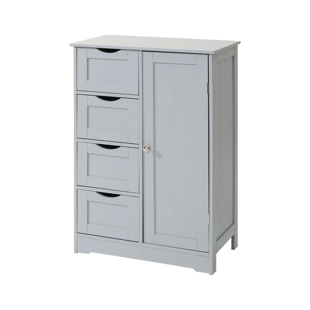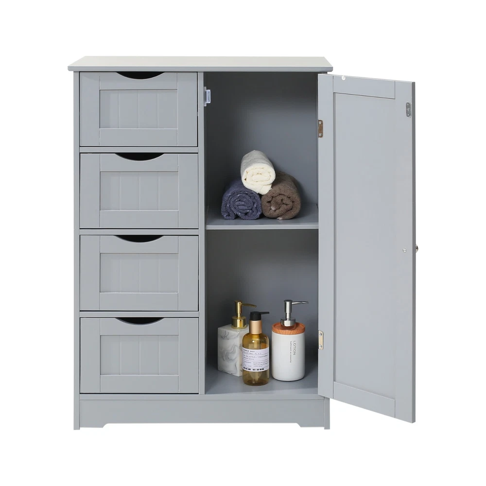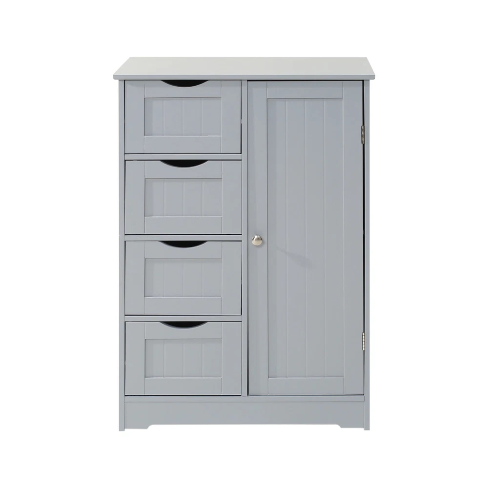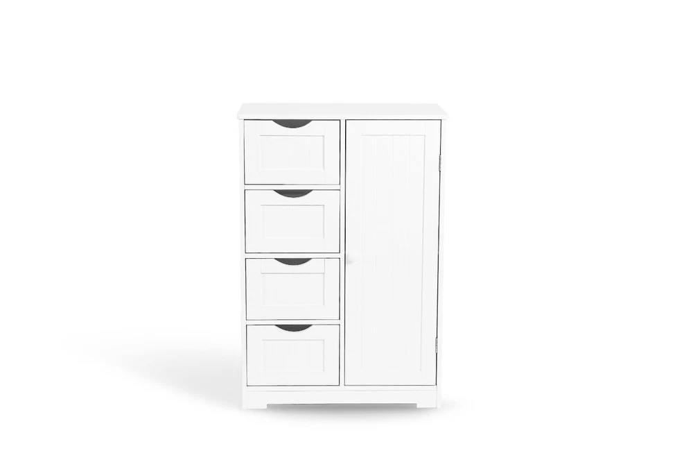 Features 4 Drawers : 4 Drawer Storage Cabinet: This bathroom cabinet features 4 deep drawers. It provides enough room to place towels, rolls, toiletries, soap, shower gel, ect. And the slide-free design simplifies the assembly steps, which is friendly to the user. Thoughtful Design: The handle-free design of the hollow pullout panel brings a simpler appearance and more convenient use. The stripe carvings on the panel are designed with complex craftsmanship just to present a more exquisite appearance. Suitable storage Space: Small bathroom floor cabinet of size 12"W x 12"D x 32"H fits neatly in narrow space between sink and toilet for easy access to bath salts and towels. It is a smart way to maximize the use of your bathroom space. Widely Use: The surface of the bathroom cabinet and the door have vertical carving patterns. This farmhouse cabinet looks sleek and design-like, suitable for your modern or country home decor. It can also be placed in the kitchen, living room, ect. Easy to Install: This cabinet unit is easy to assemble with the instructions, even if you are fresh to do it. If you have any questions with our cabinet or its operating steps, please contact us freely. We will support you within 24 hours. Specifications 4 Drawers : Color : Grey / White Recommended Uses For Product : Towels Product Dimensions: 11.81" x 11.81" x 32.50" Inches Special Feature: Removable Shelf Material: Engineered Wood Style: Modern Number of Drawers: 4 Shape: Rectangular Package Contents 4 Drawers Bathroom Floor Cabinet Features 4 Drawers & 1 Door : The Bathroom 4 Drawer 1 Door Free Standing Unit has a modern and stylish design that will complement any bathroom decor. The elegant smooth white finish adds a touch of sophistication to the unit, making it a great addition to any home. The Bathroom 4 Drawer 1 Door Free Standing Unit features four drawers and 1 cupboard, providing plenty of storage space for your bathroom essentials. You can easily store your towels, toiletries, and other items in this unit, keeping your bathroom tidy and organized. This bathroom drawer unit is made from MDF, a sturdy and durable material that can withstand daily wear and tear. MDF is also resistant to warping and cracking, ensuring that this unit will last for many years. Cleaning this unit is effortless. You only need to wipe it with a dry cloth to remove any dust or dirt, making it easy to maintain its pristine appearance. This free-standing unit is not limited to the bathroom only. You can use it in other rooms of your home, such as the bedroom or laundry room, to store your items. Specifications 4 Drawers & 1 Door : Color : White / Grey Recommended Uses For Product : Towels Product Dimensions: 22"L : x 12"W x 32.5"H In. Special Feature: Removable Shelf Material: Engineered Wood Style: Modern Number of Drawers: 4 Number of Cabinet : 1 Shape: Rectangular Package Contents 4 Drawers & 1 Door : Bathroom Floor Cabinet