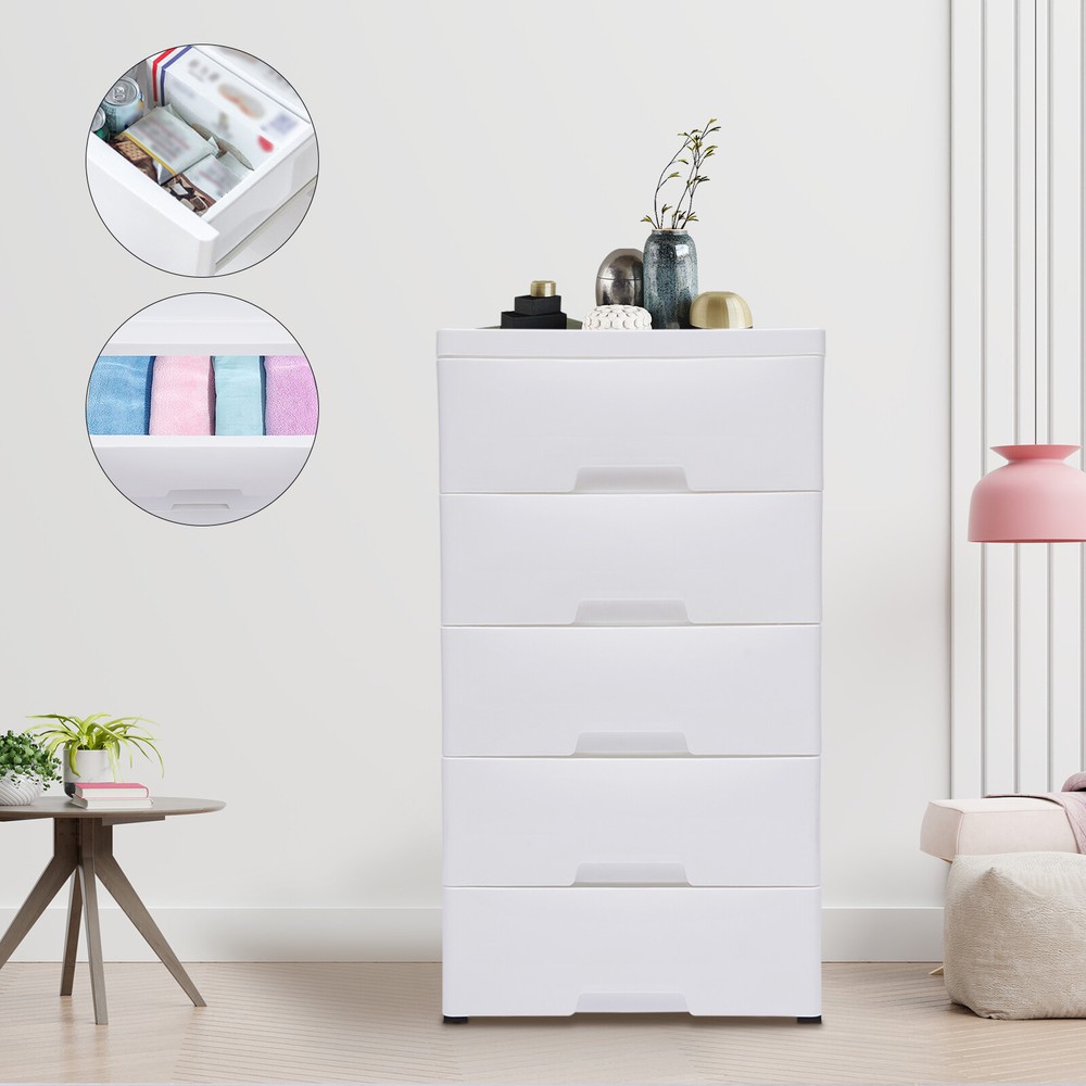 Description Are you still struggling with where to put the miscellaneous items in your room? Or bothered by the cluttered arrangement? If you answered yes to these questions, you shouldn't miss this 5-drawer storage cabinet. It uses healthy and environment-friendly PP material that you can use with confidence and it allows you to store many different types of items. Let you say goodbye to your messy home. Specification Material: PP Color: White Layers: 5 Style: Modern Gross Weight: 4.9kg/10.8lbs Net Weight: 4.1kg/9.04lbs Load Capacity: 25kg/55.12lbs Package Size: 45.5*37*32cm/17.91*14.57*12.6inch Product Size: 43.5*29*80cm/17.1*11.4*31.5in Drawer Internal Size: 36*23*14cm/14.17*9.06*5.51inch White Bedroom Closet Entryway Chest 5Drawer Dresser Storage Tower Organizer Rack Description~ Description: Are you still struggling with where to put the miscellaneous items in your room? Or bothered by the cluttered arrangement? If you answered yes to these questions, you shouldn't miss this 5-drawer storage cabinet. It uses healthy and environment-friendly PP material that you can use with confidence and it allows you to store many different types of items. Let you say goodbye to your messy home. Key Features: Healthy and Durable Material: The storage cabinet is made of healthy and environment-friendly PP material, which is non-toxic and tasteless . It is not only harmless to human health but also very strong and durable. Large Capacity: This storage cabinet has 5 drawers and a flat top. You can sort and place many things inside to make your room tidier. The storage space is large enough to meet your needs. Highly Sealed: The storage cabinet is seamlessly integrated, which can effectively prevent mold and insects and provide protection for clothes and items all the time. Safety Protection : Each layer of drawers has a snap design so that the drawer will not completely slide down to hit you. And the rounded corners without burrs will not scratch your hands. Space-saving: It saves space by making full use of vertical space. It only needs to be placed in small corners of living rooms, bedrooms and bathrooms without taking up too much space. Strong Load-bearing Capacity: This storage cabinet made of PP is strong and stable with a load-bearing capacity of 25kg/55.12lbs, so you can place many items with confidence. Easy to Access: Each drawer of this storage cabinet has a full pull-out design and a handle, which can display all items and make it more convenient to pull the drawer to easily access items inside. Easy to Move: The bottom of the storage cabinet has 4 wheels, so you can easily move the cabinet, which saves time and effort. Versatile Decorative Item: This storage cabinet is in white, which is a versatile color. Coupled with its simple and generous design, it can fit greatly into various decoration styles and scenes. Ideal Gift: This storage cabinet has a unique design with a beautiful appearance and a large capacity with practical features. It is an ideal gift for Valentine's Day, Mother's Day, Thanksgiving, Christmas, and weddings. Details Reinforced Flat Top: The reinforced flat top is finely made and has a strong load-bearing capacity that allows it to hold many items. And it is not only easy to access but also very space-saving. Curved Handle: The handle of these drawers is a built-in curved handle that fits the shape of your hand. You can easily pull it out and do not worry about the handle loosing. This is both beautiful and practical. Removable Pulley: The pulley at the bottom of the storage cabinet makes it easy to move. If you don't need the pulley, you can also remove it, which is very flexible. Spare Wheel: We provide an extra spare wheel. If the wheel is accidentally damaged, you don't have to buy a new wheel. You just need to put the spare wheel on, which is very convenient and saves money. Application This item can be used in bedrooms, living rooms, studies, powder rooms, beauty stores, etc. for neatly storing books, office supplies, snacks, household items, etc. Specification Material: PP Color: White Layers: 5 Style: Modern Gross Weight: 4.9kg/10.8lbs Net Weight: 4.1kg/9.04lbs Load Capacity: 25kg/55.12lbs Package Size: 45.5*37*32cm/17.91*14.57*12.6inch Product Size: 43.5*29*80cm/17.1*11.4*31.5in Drawer Internal Size: 36*23*14cm/14.17*9.06*5.51inch Package Included 10* Side Plates 5* Backplates 1* Top Plate 5* Drawers 5* Wheels 4* Wheel Covers 1* English Manual All Accessories for Assembly Notes Please allow the slight color difference caused by the shooting light and 1-3cm error due to manual measurement, and make sure you do not mind before you order. Payment Delivery details Terms of sales About us Contact us Payment We accept ebay payment 。 Fees such as import duties, taxes are not included in the item price or shipping costs. These charges are the buyer's responsibility. Delivery details Shipping: 2-9 working days to: USA Terms of sales We maintain high standards of excellence and strive for hundred percent customer satisfaction. Feedback is very important to us. We hope that you contact us immediately before you give neutral or negative feedback, so that we can address your concerns. It is impossible to address issues if we do not know about them! About us Your satis faction is our ultimate goal. We work hard to earn your trust and future business. Our certified technicians have tested each item before shipping. The unit comes with 1 year limited warranty on all manufacturing defects. a) If you receive a defective item, you may return it or ask for a discount. Please contact us within 14 days after you receive the package. b) What you returned must be intact and in its original packaging as re? u. Customer is responsible for shipping costs of the returned item. c) We will cover the cost of shipping back t with the shipping rate indicated in the registration page. We will send you a new unit or refund the full payment you paid. Thank you. Contact us Business Hour Business